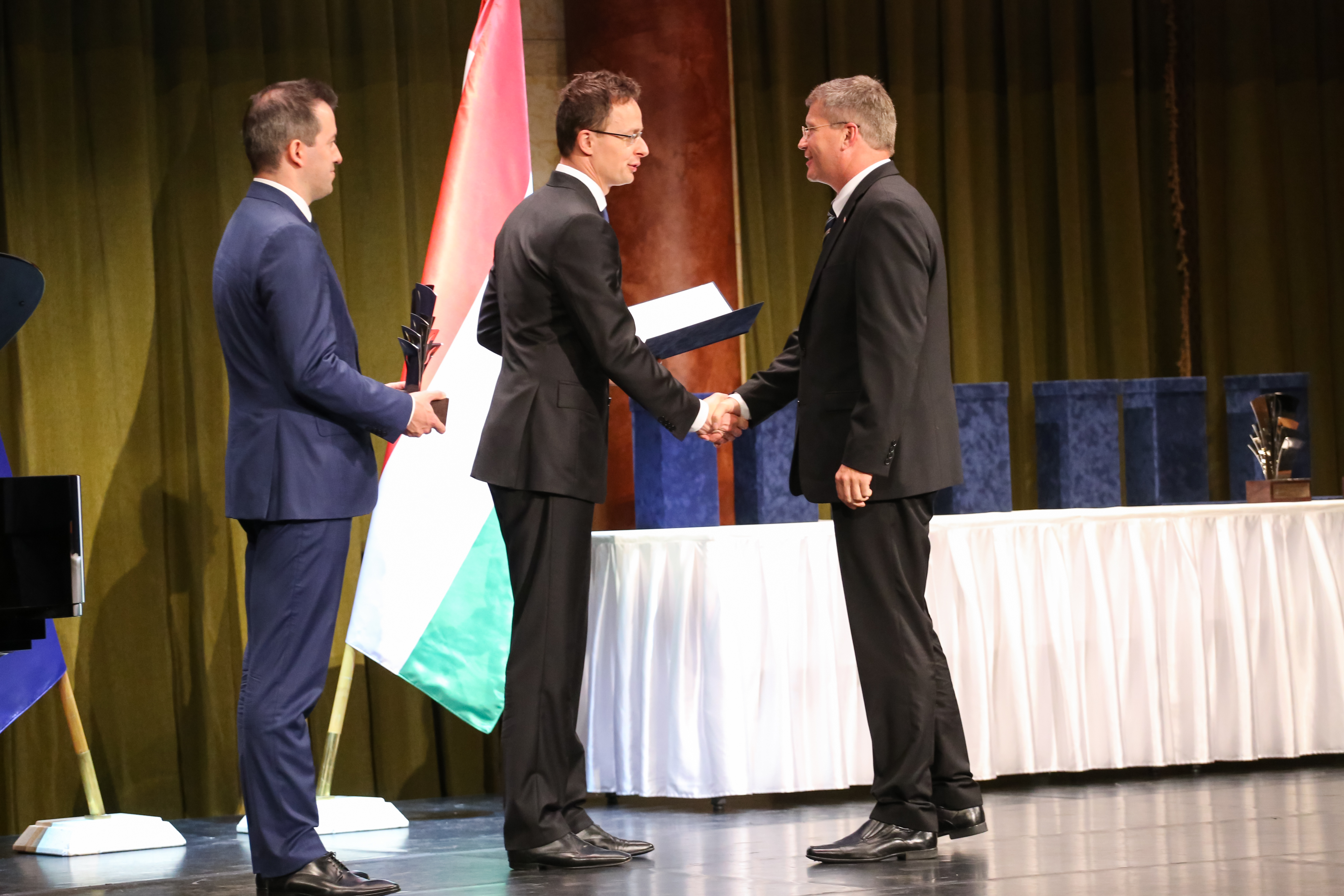 At the ceremony for the seven Investor of the Year awards for 2015, Robert Bosch Kft. was pronounced “Company of the Year for R&D Investment”. On the picture from left: Róbert Ésik, president of Hungarian Investment Promotion Agency, Péter Szijjártó, Minister of Foreign Affairs and Trade and Oliver Schatz, head of Bosch Engineering Center Budapest
