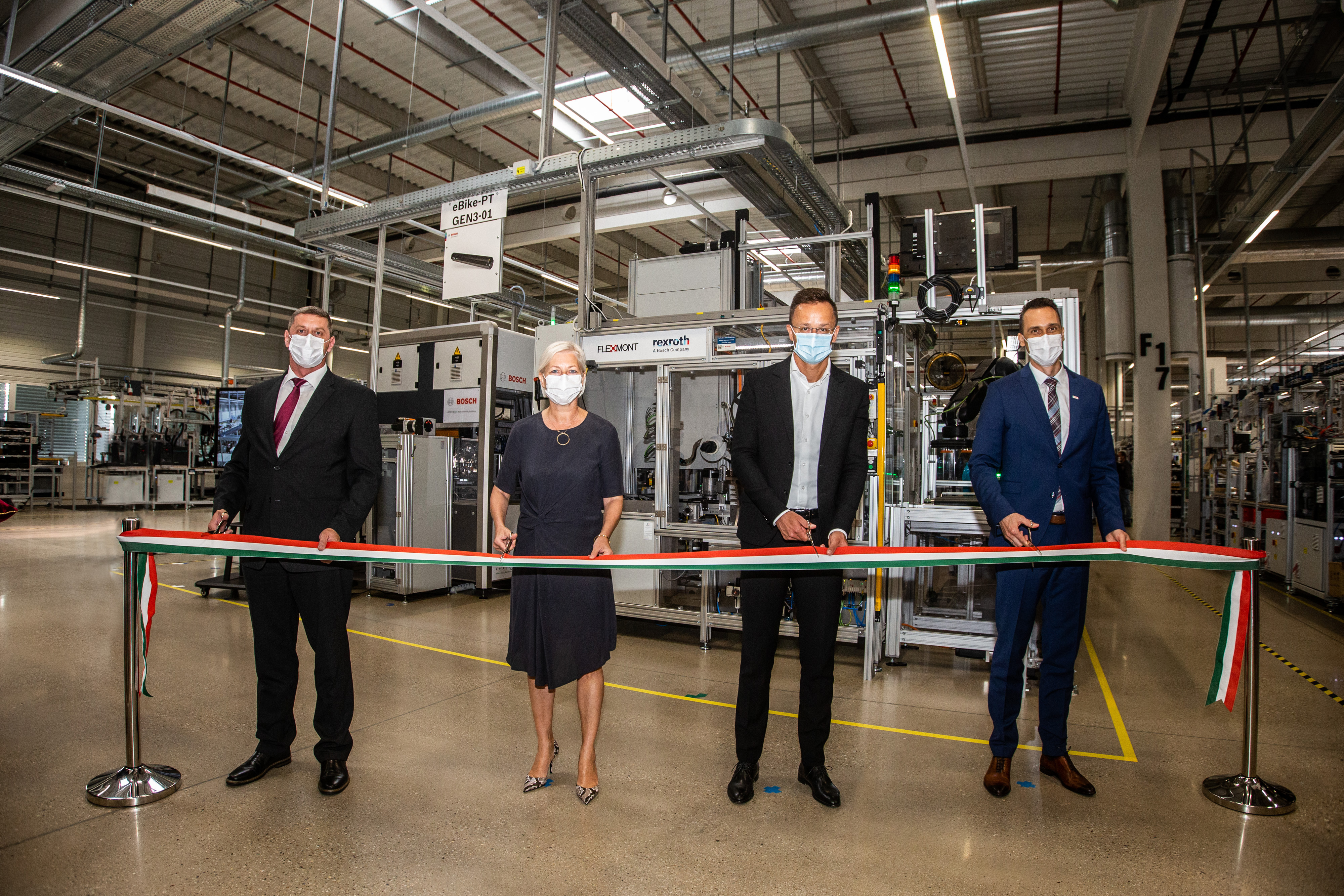 Shown here (from left): László Fükő, general manager of Robert Bosch Power Tool Elektromos Szerszámgyártó Kft., Katalin Csöbör, Parliamentary Representative of Borsod-Abaúj-Zemplén county, Péter Szijjártó, Minister of Foreign Affairs and Trade and Dr. István Szászi, Representative of the Bosch Group in Hungary from July.