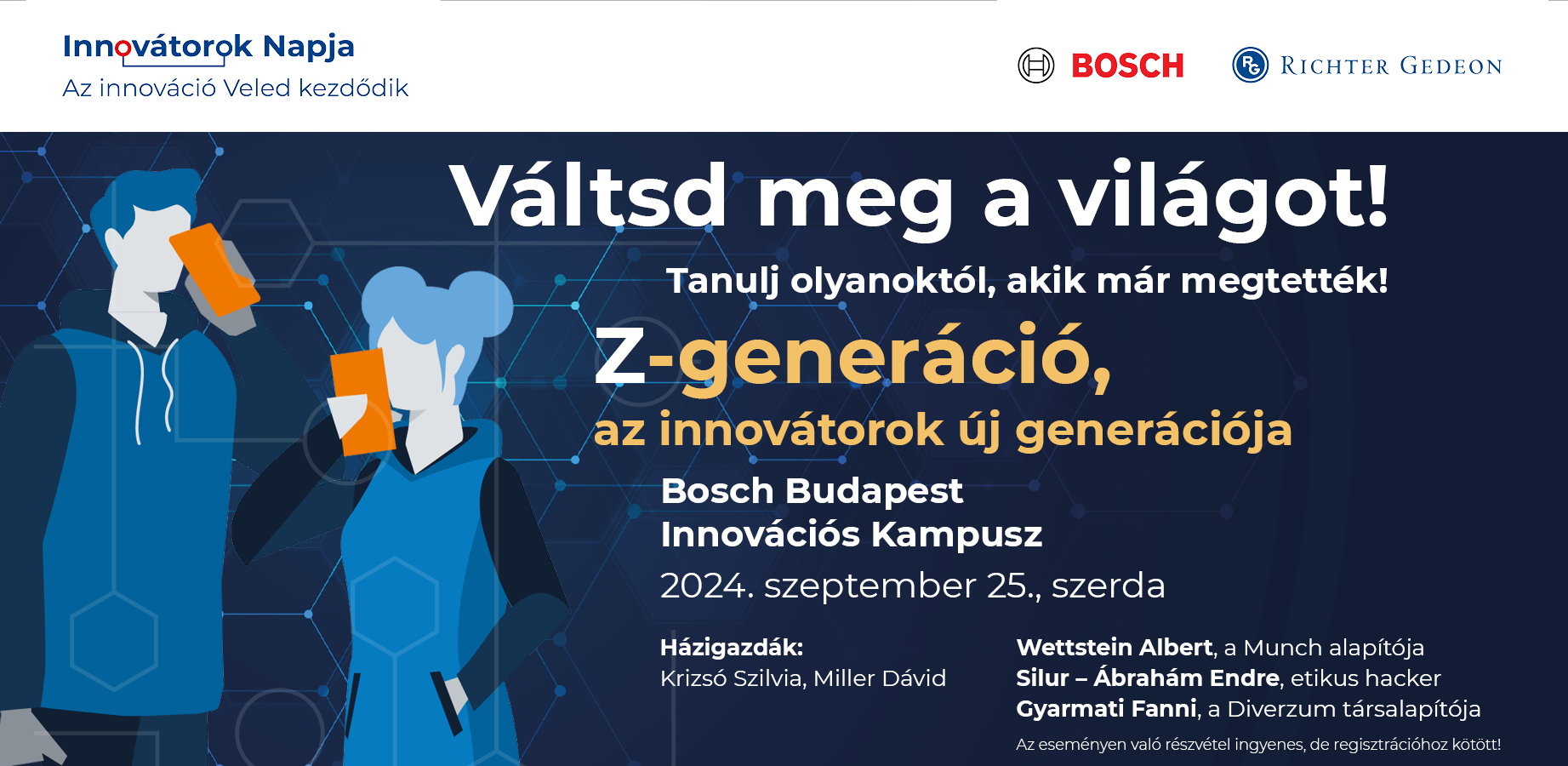 The speakers and panelists at the Bosch×Richter Innovators Day will include successful startup entrepreneurs from Generation Z. Albert Wettstein, founder of Munch, Fanni Gyarmati, co-founder of Diverzum and Endre “Silur” Ábrahám, ethical hacker, will share their thoughts on the desire to innovate, motivation and the “innovator career”, among other topics. The latest results of a public opinion poll on young people's attitudes towards innovation will be presented by generations researcher Krisztián Steigervald.