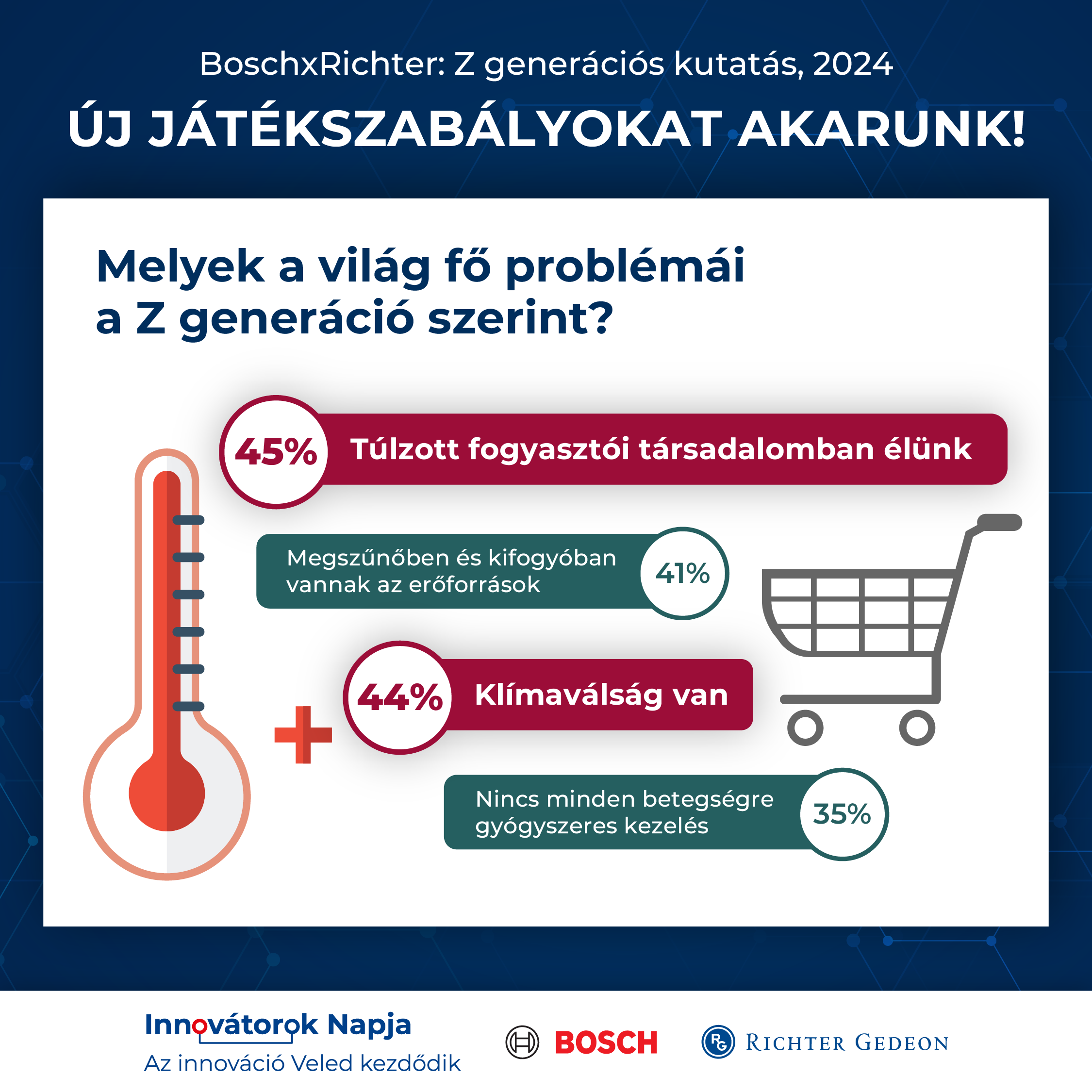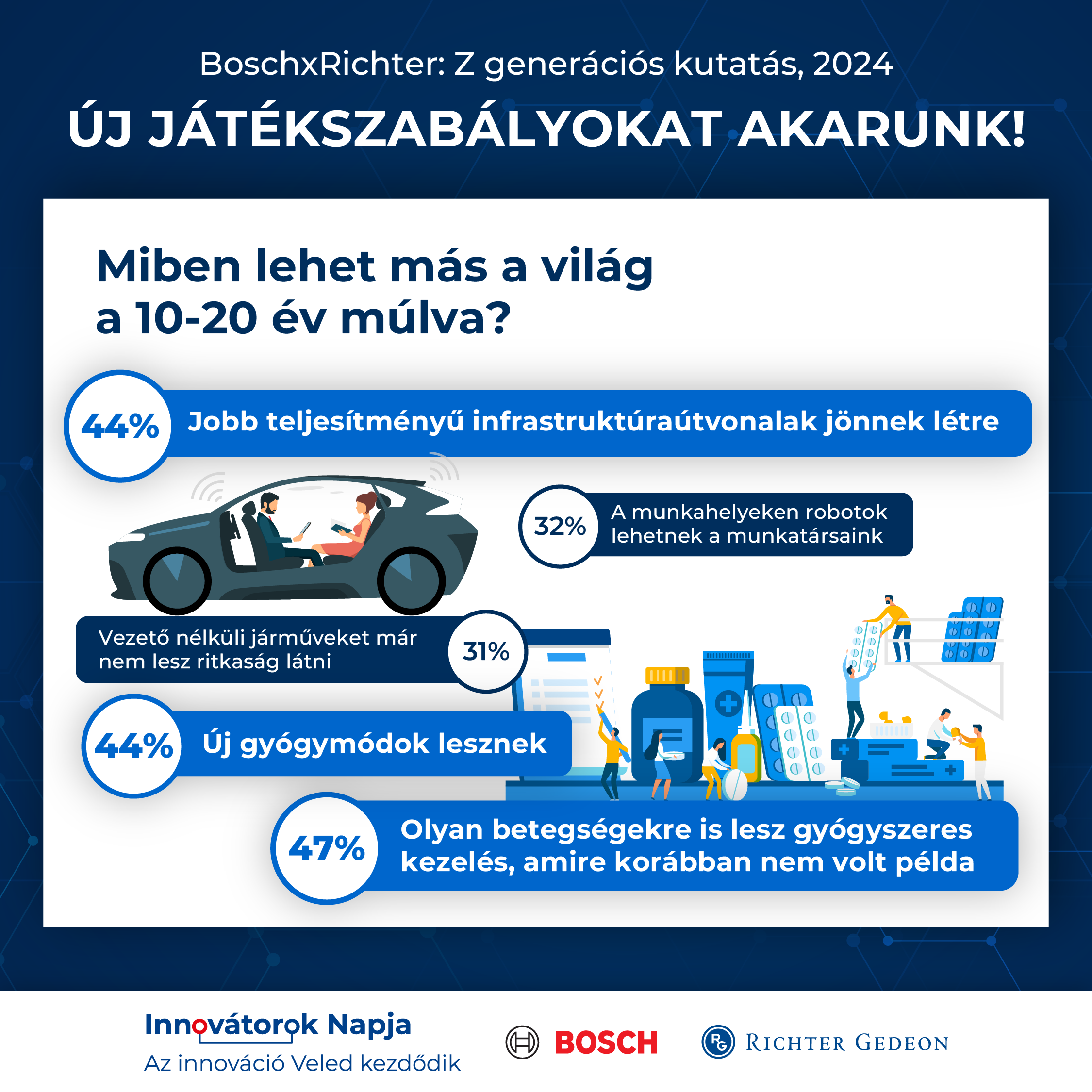 Budapest – For Generation Z, those born between 1997 and 2012, innovation is now much more than technological progress. What changes might this new outlook bring to the economy, higher education, the workplace, transport or medicine? This time, two of Hungary's leading innovative companies, the Bosch Group in Hungary and Gedeon Richter Plc., explored the issues of the future and innovation from the perspective of Generation Z in a joint opinion poll. The new research results were presented at the Bosch×Richter Innovators' Day on 25 September 2024 at the Bosch Budapest Innovation Campus.