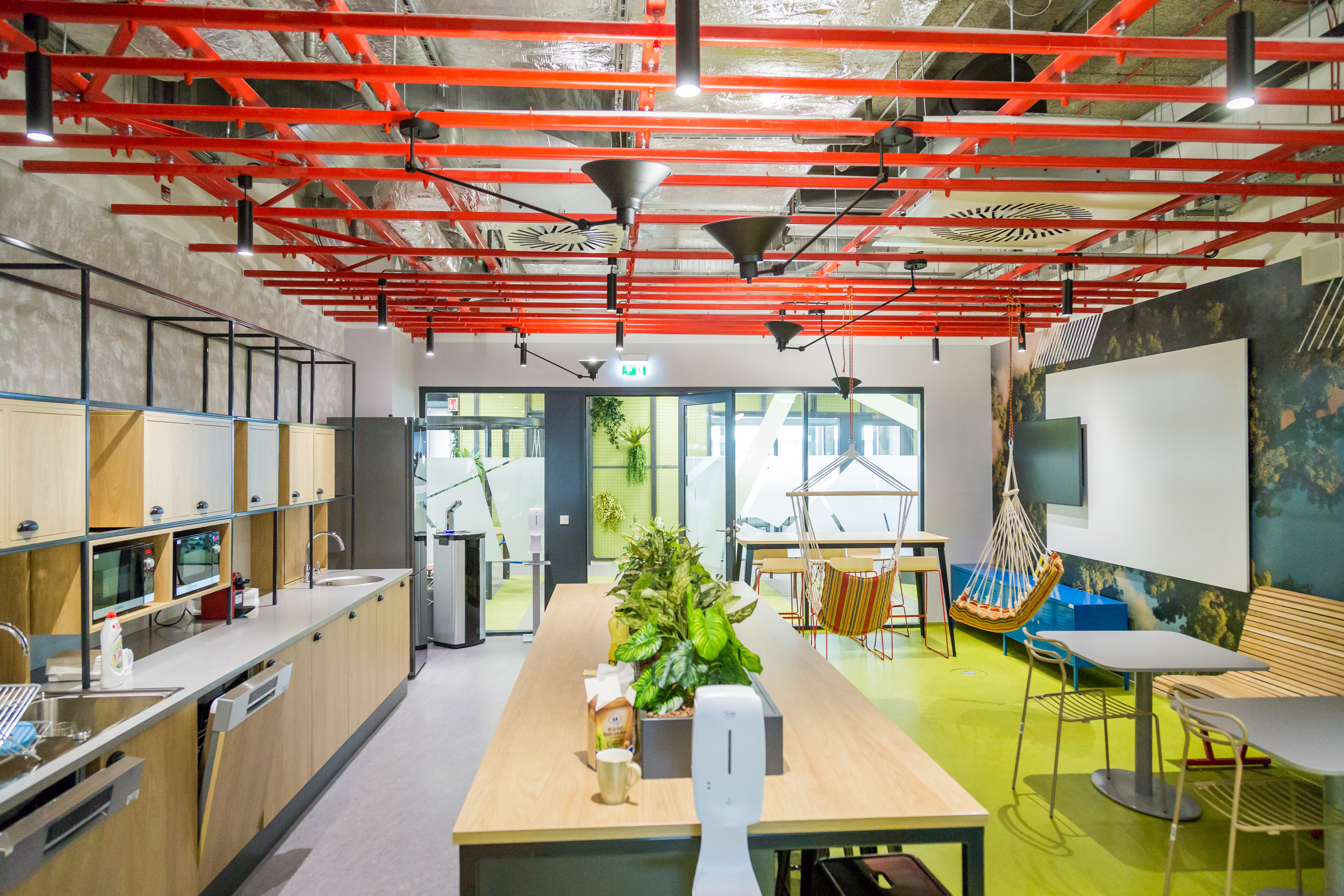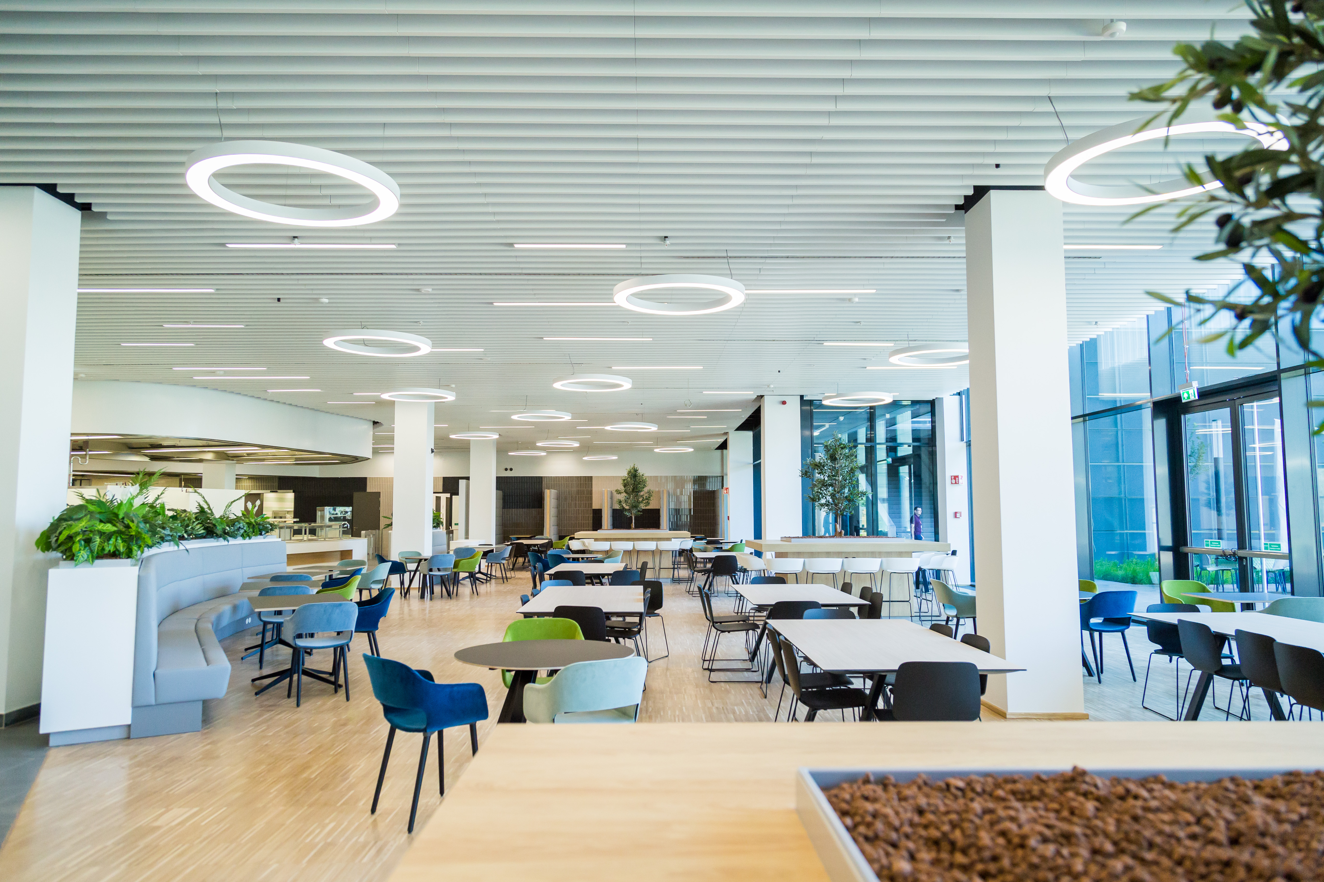 The Bosch Budapest Innovation Campus is a vision of the workplace of the future, providing an inspiring and creative working environment for the employees. The design of the different functions is in line with the company's new way of working concept. Taking into account the latest HR trends and feedback from employees, the architectural design placed particular emphasis on creating collaborative spaces for creative thinking and inspiration, and meeting rooms were equipped with state-of-the-art technology for professional online meetings. Working and recharging can not only happen inside but also in the roof garden and the green park surrounding the building. In addition to the basic functions, the main building will also include a 500-seat auditorium equipped with state-of-the-art conference technology, which will host professional, business, and artistic events in addition to internal events.