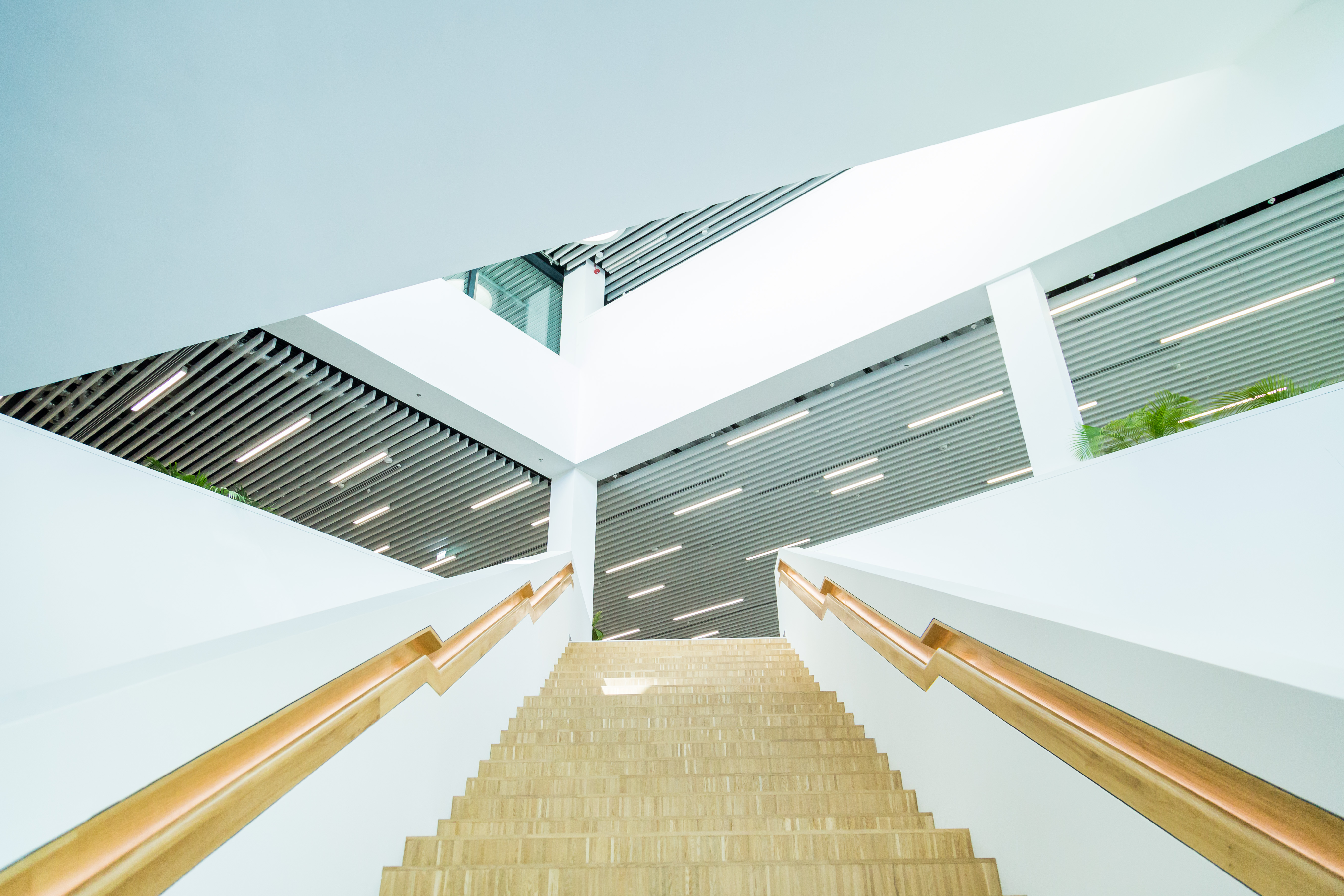 The scale of the investment is reflected in the more than 200 new trees, 40,000 shrubs and perennials and 1.5 hectares of grass and mulch planted in the campus park. The building used 46,000 cubic meters of concrete, 5,600 tons of rebars, 700 tons of structural steel and one and a half million meters of electrical cables.