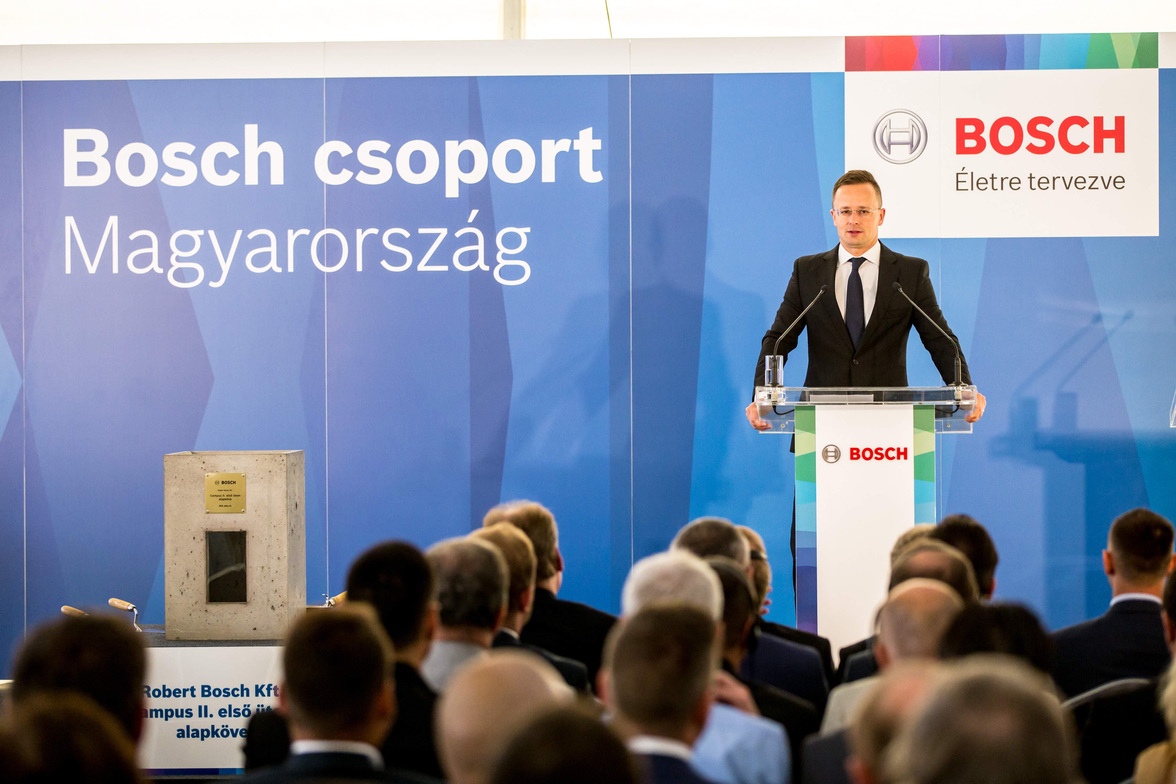 Budapest – The foundation stone laying ceremony today marks the start of a new expansion to the Bosch Engineering Center Budapest campus. Planned for completion by 2021, the first phase of building has a budget of 37 billion forints. The event was attended by Péter Szijjártó, Minister of Foreign Affairs and Trade, Dr. Klaus-Peter Fouquet, Chairman of Supervisory Board of Robert Bosch Kft., Daniel Korioth, Representative of the Bosch Group in Hungary, and Oliver Schatz, Head of Engineering Center Budapest.