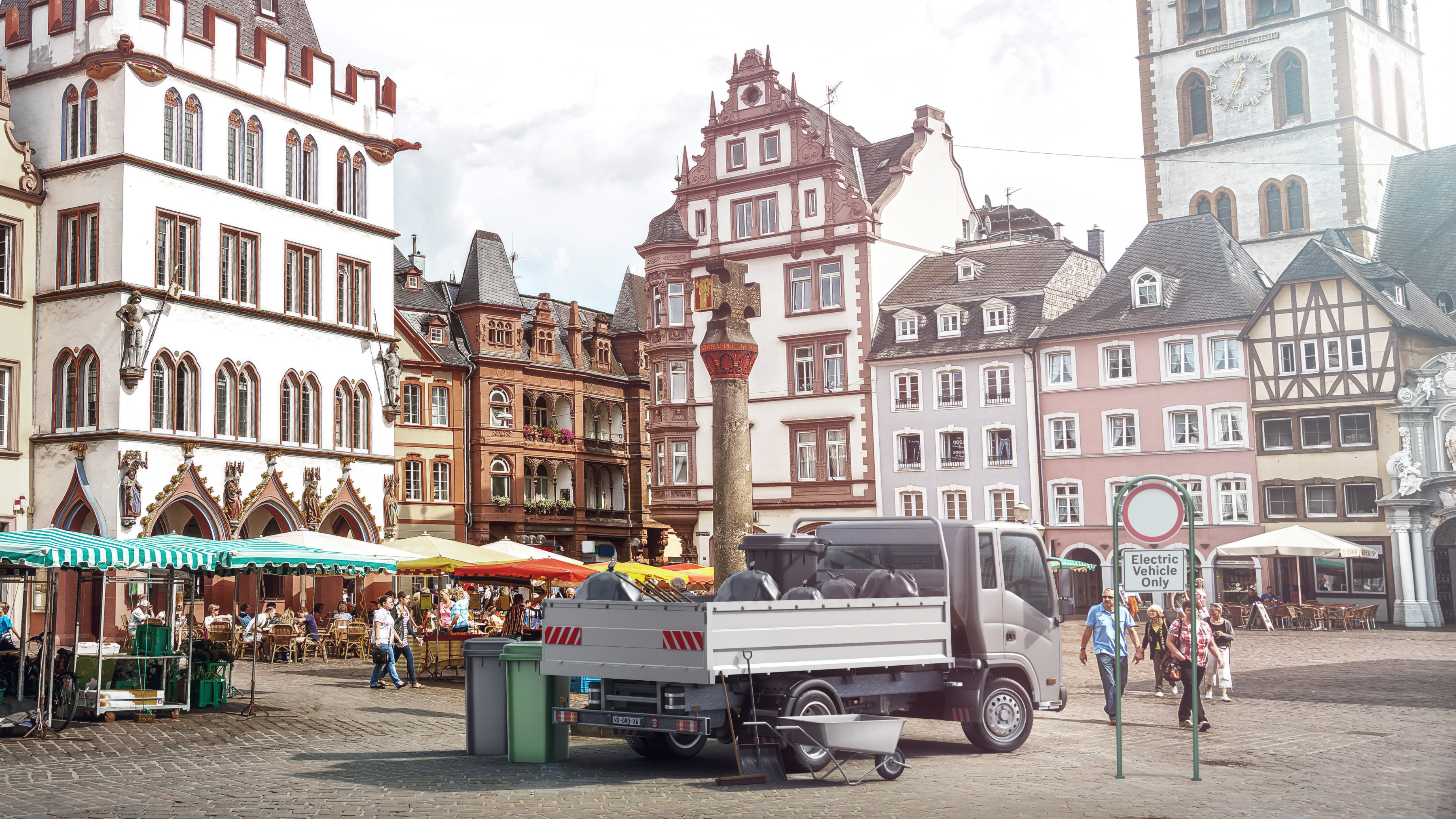 By 2030, global goods traffic will nearly double (source: ITF). “We want trucks to be beasts of burden, but not a burden for the climate or for air quality. Again, the key here is electrification,” Denner said. As early as 2030, one in four new commercial vehicles worldwide – nearly one in three in China – will be at least partly electrically powered. Bosch stands to benefit: the company’s product portfolio for emissions-free goods transportation includes 36-volt power packs for cargo e-bikes, electric motors for light commercial vehicles like the German Post Office’s StreetScooters, e-axles for light and heavy vans, electrified axles for semitrailers, and, in the future, fuel-cell powertrains for 40-ton trucks. “Whether it’s partially electric, fully electric, battery-electric, or fuel cells, we are ready for the market,” Denner said.