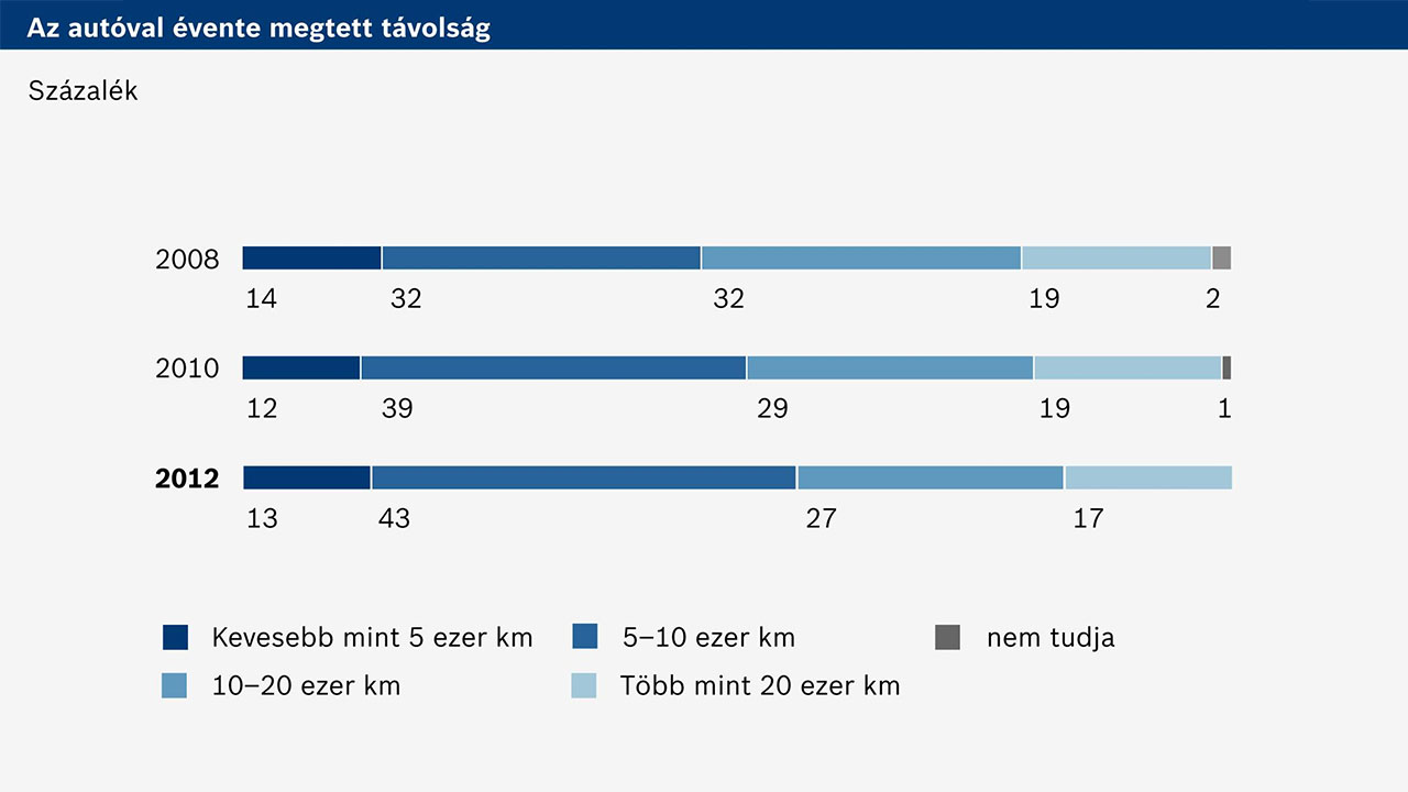 2010-ben a fővárosiak autóztak a legtöbbet: közel 60 százalékuk tett meg évente több mint 10 ezer kilométert, idén viszont a budapestieknek már csak alig több mint 40 százaléka utazik ennyit. A 2012. évi kutatási adatokból az látszik, hogy jelenleg a vidéki városban élők teszik meg a legtöbb kilométert gépjárművükkel. A férfiak és a háztartásban egy főre jutó jövedelem szerint a legjobb helyzetűek idén is többet autóznak, mint a nők, és az alacsonyabb jövedelműek. Így ebben a tekintetben nem történt változás a korábbi évekhez képest. A fiatalabb személygépkocsik is a legjobb jövedelemmel rendelkezők birtokában vannak, ezért az 5 évesnél fiatalabb gépjárműveket használják a legtöbbet, azonban még a 20 évesnél idősebb autók is átlagosan évi 11 000 kilométert tesznek meg.