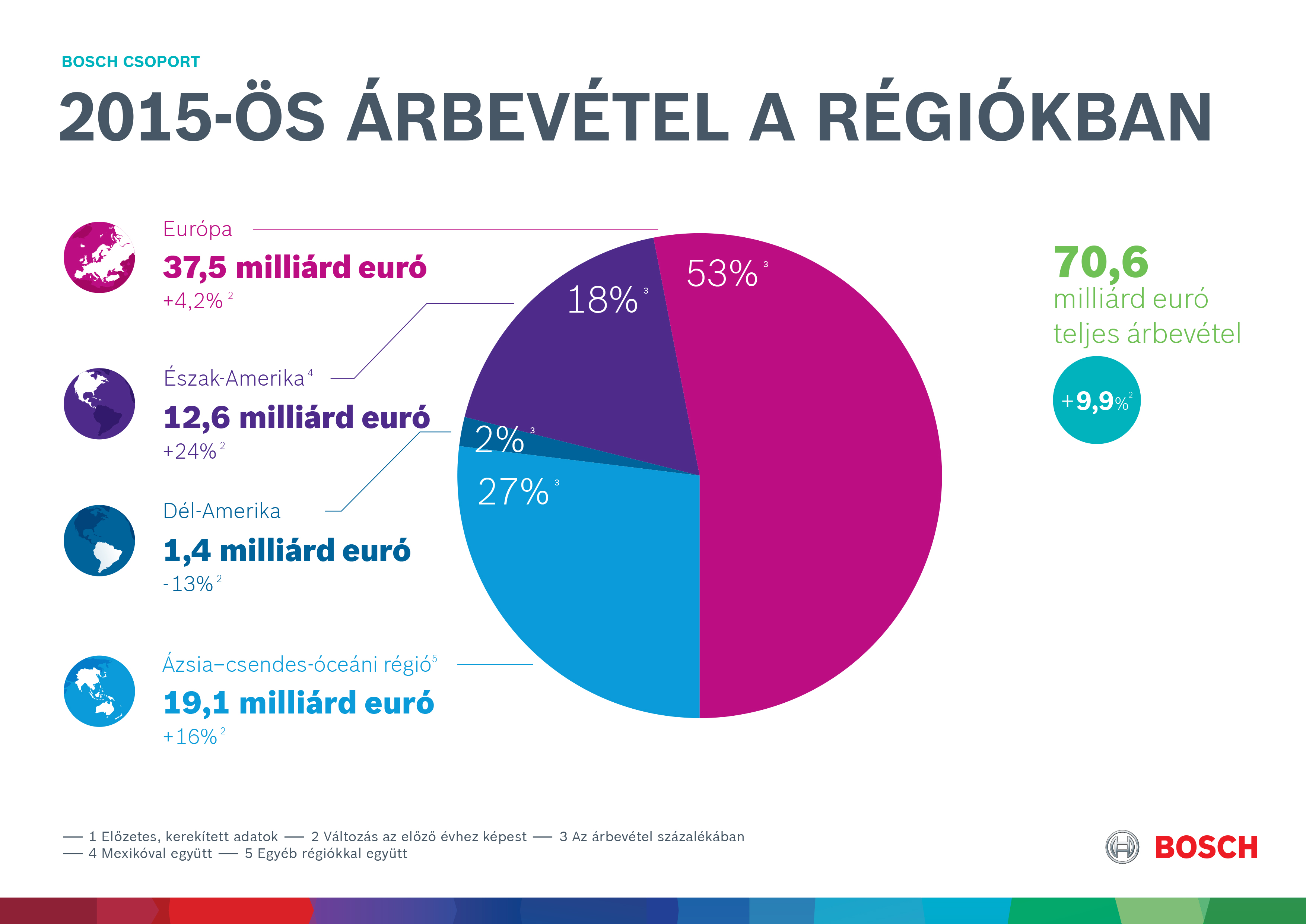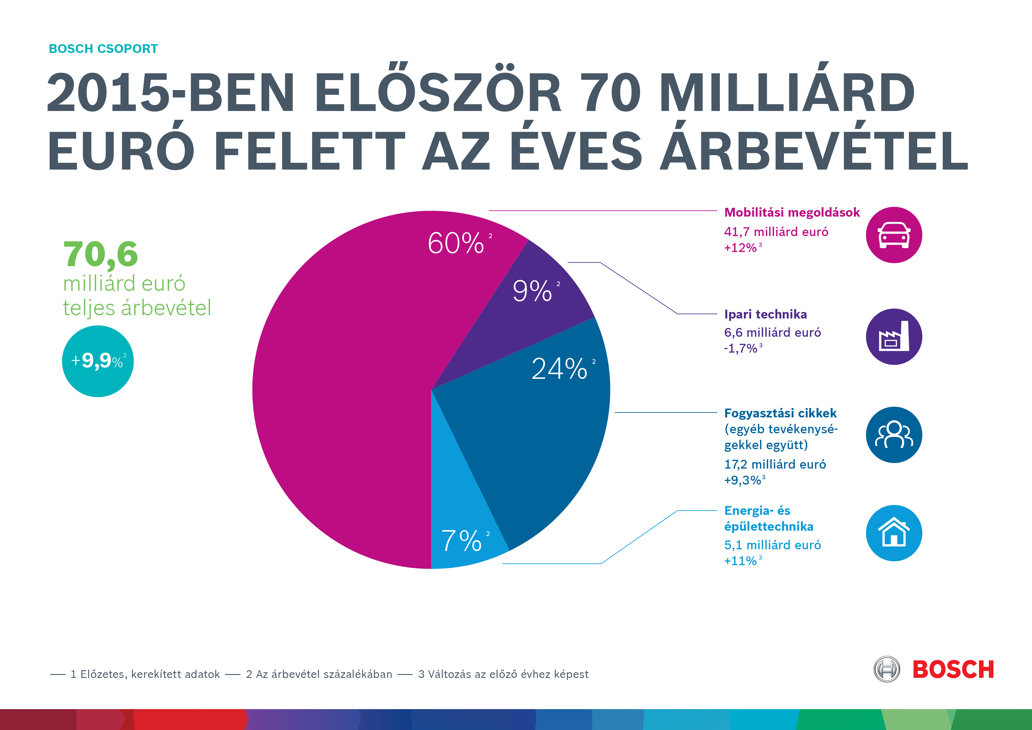 Stuttgart – In 2015, the Bosch Group recorded sales of over 70 billion euros for the first time, according to preliminary figures. The company succeeded in increasing revenue by approximately ten percent1 last year. Earnings also further improved. Including extraordinary effects, earnings before interest and taxes (EBIT) rose to around five billion euros. Adjusted for extraordinary effects, earnings totaled roughly 4.5 billion euros. EBIT margin from operations was approximately 6.5 percent, which is higher than the previous year when calculated on a comparable basis. Equity ratio remains sound and liquidity remains high despite the billions spent on the acquisitions of BSH Hausgeräte GmbH and Robert Bosch Automotive Steering GmbH. “Thanks to our innovative strength, we were able to successfully continue our growth trend in a challenging business environment and a number of stagnating markets in 2015. A major driver of this positive business development was an increasing number of solutions for the connected world,” said Dr. Volkmar Denner, chairman of the board of management of Robert Bosch GmbH.