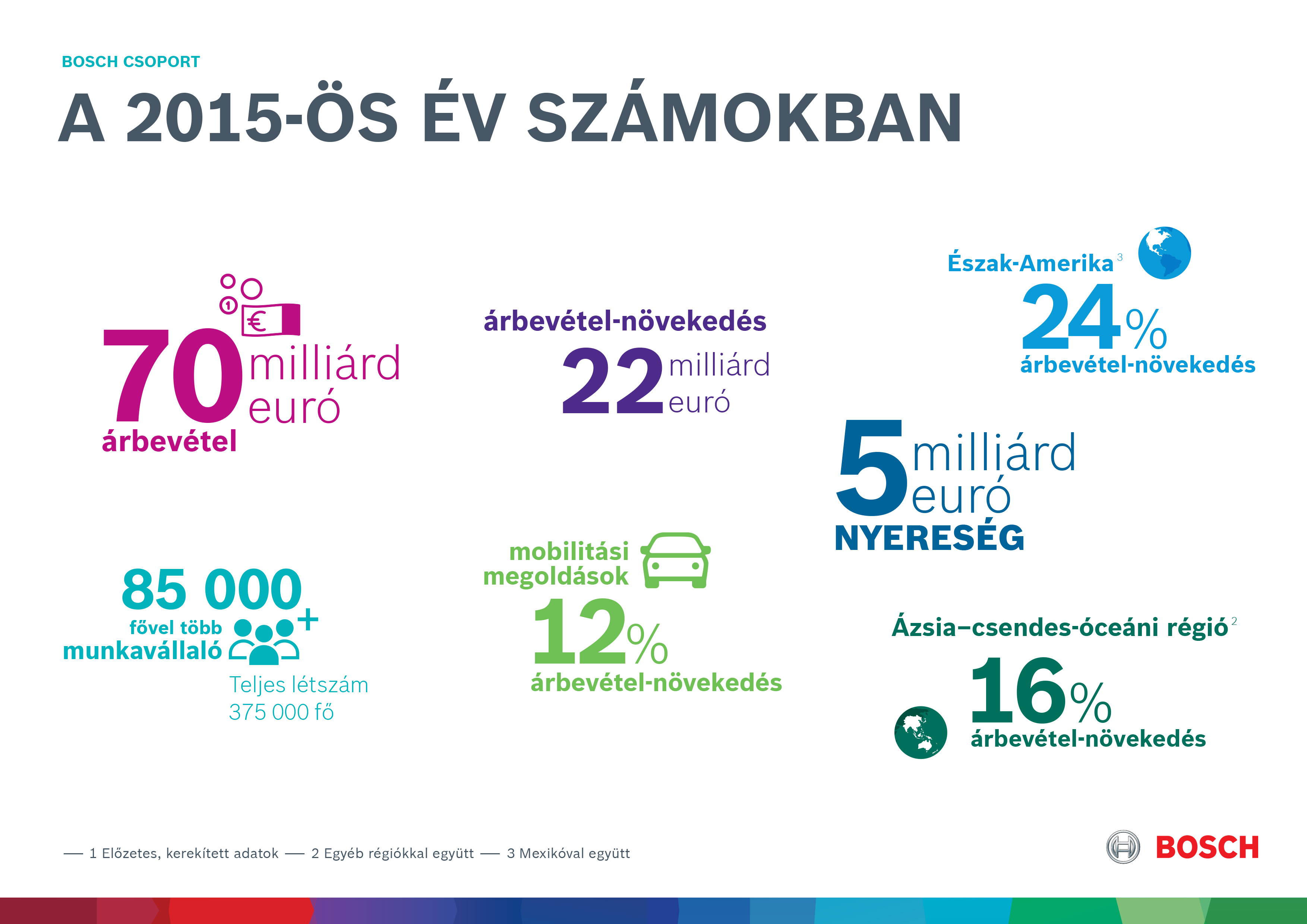 1The recently-acquired companies Robert Bosch Automotive Steering GmbH (formerly ZF Lenksysteme GmbH) and BSH Hausgeräte GmbH (formerly BSH Bosch und Siemens Hausgeräte GmbH) are fully consolidated in the 2015 figures for the first time. All figures for 2014 have been adjusted to facilitate a like-for-like comparison.