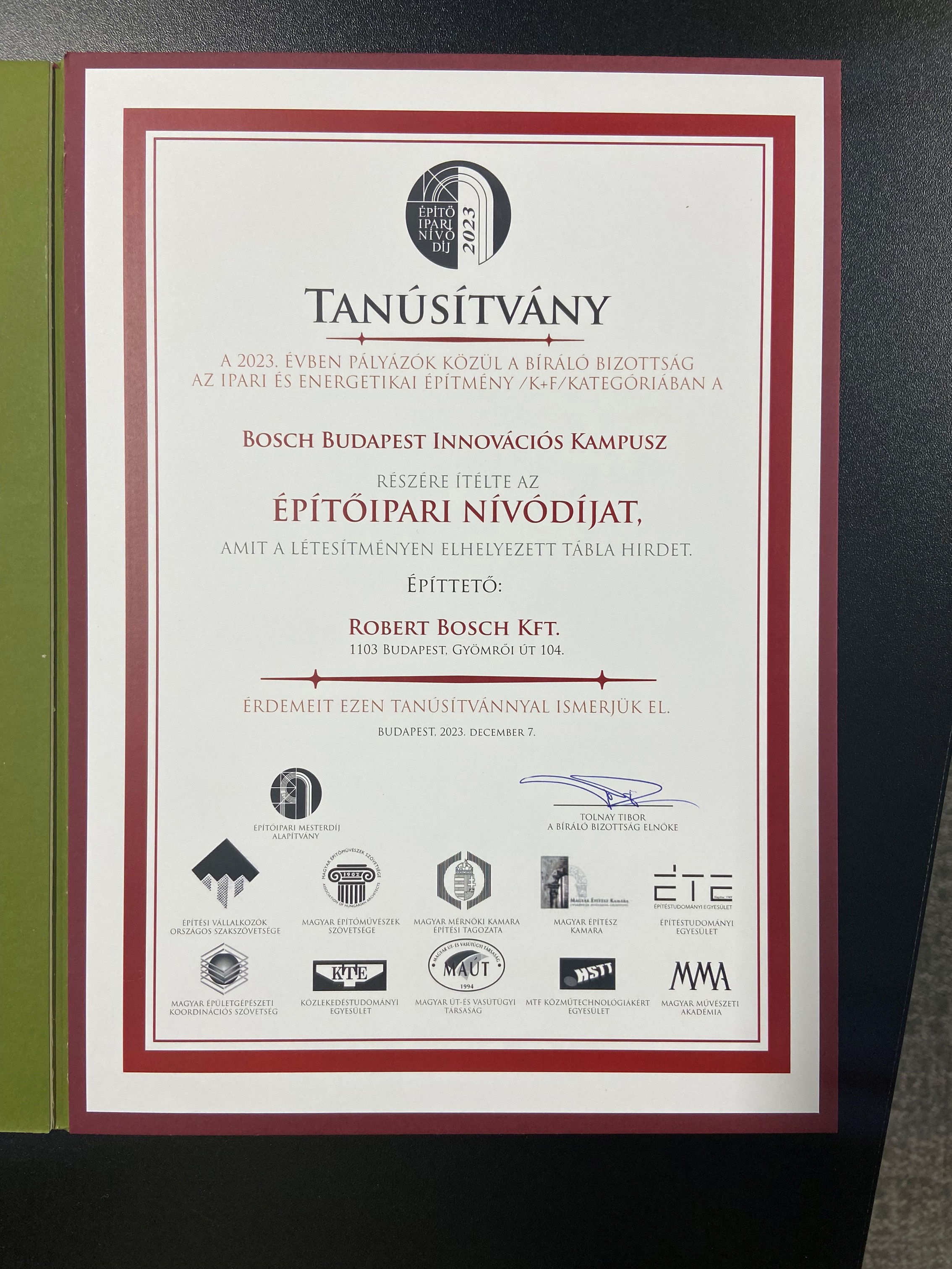 A Bosch Budapest Innovációs Kampusz ipari építmény kategóriában elnyerte az Építőipari Nívódíjat