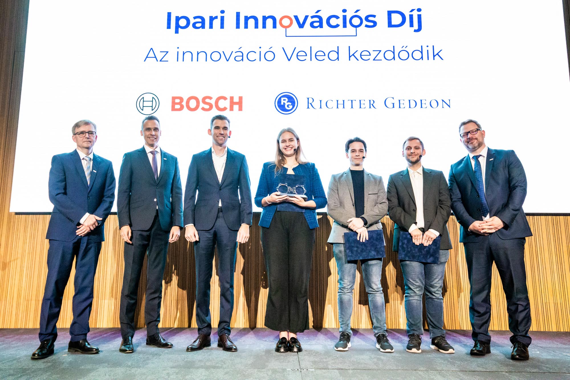 A Bosch×Richter Ipari Innovációs Díj átadása, balról jobbra: Kemler András, a Bosch csoport létesítménygazdálkodásért felelős vezetője Magyarországon és az Adria régióban, Dr. Szászi István, a Bosch csoport vezetője Magyarországon és az Adria régióban, Pótsa Mátyás, a magyarországi Bosch csoport innovációs ökoszisztéma vezetője, a Bosch×Richter Ipari Innovációs Díj zsűrijének tagja, Belkovics Fanni, Mező-Kerekes Márk és Matkovics Ádám, a Bosch×Richter Ipari Innovációs Díj nyertes csapata és Somogyi András, a Bosch csoport humán erőforrásért felelős alelnöke Magyarországon és az Adria régióban