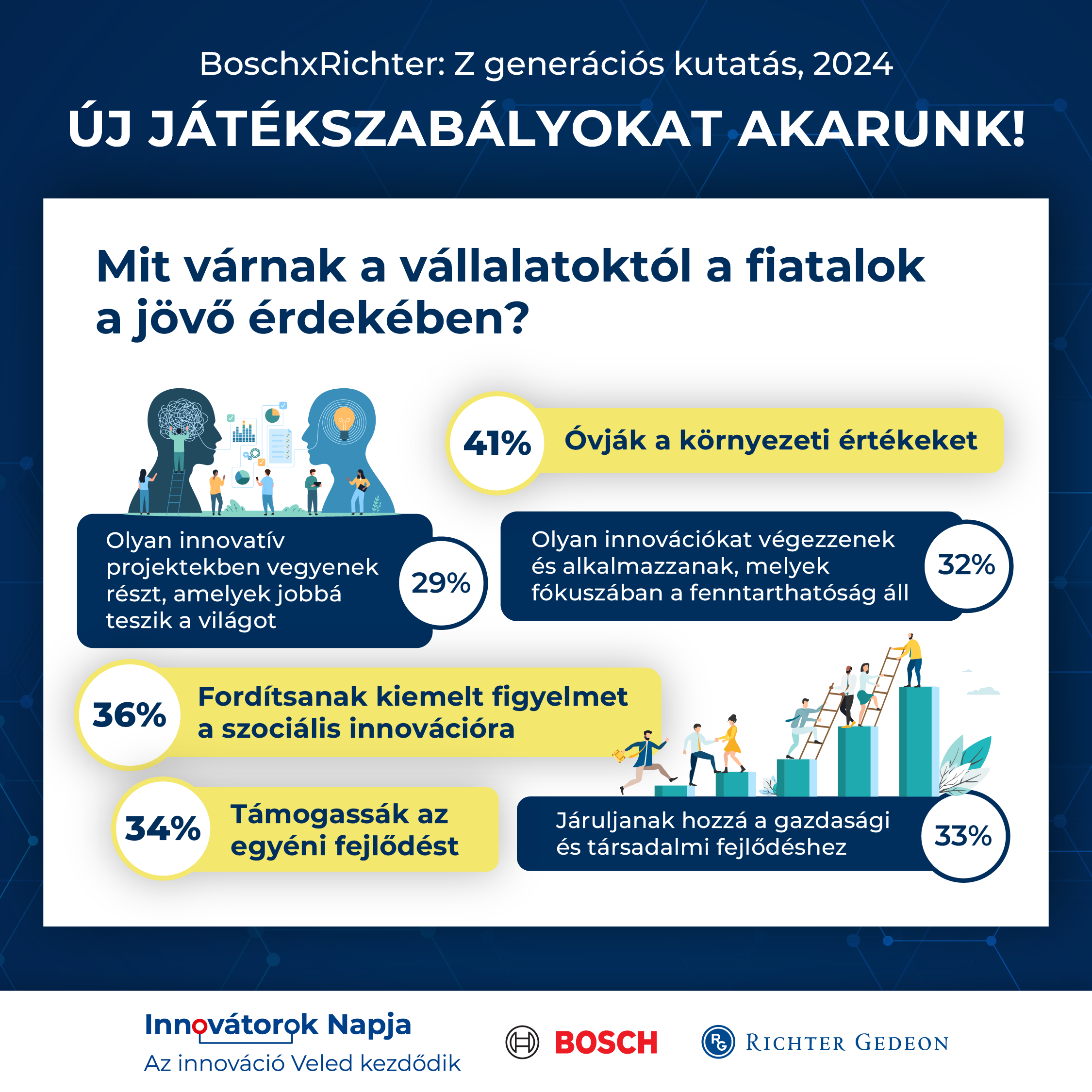 Budapest – A Z generáció, vagyis az 1997 és 2012 között születettek számára ma már az innováció sokkal többet jelent a technológiai fejlődésnél. Milyen változásokat hozhat a fiatalok új szemlélete a gazdaságban, a felsőoktatásban, a munkahelyeken, a közlekedésben vagy a gyógyításban? A jövő és az innováció kérdéskörét ezúttal a Z generáció szemszögéből járta körül közös közvélemény-kutatásában hazánk két meghatározó innovatív nagyvállalata, a magyarországi Bosch csoport és a Richter Gedeon Nyrt. A friss kutatási eredményeket a Bosch×Richter Innovátorok Napján mutatták be 2024. szeptember 25-én a Bosch Budapest Innovációs Kampuszon.