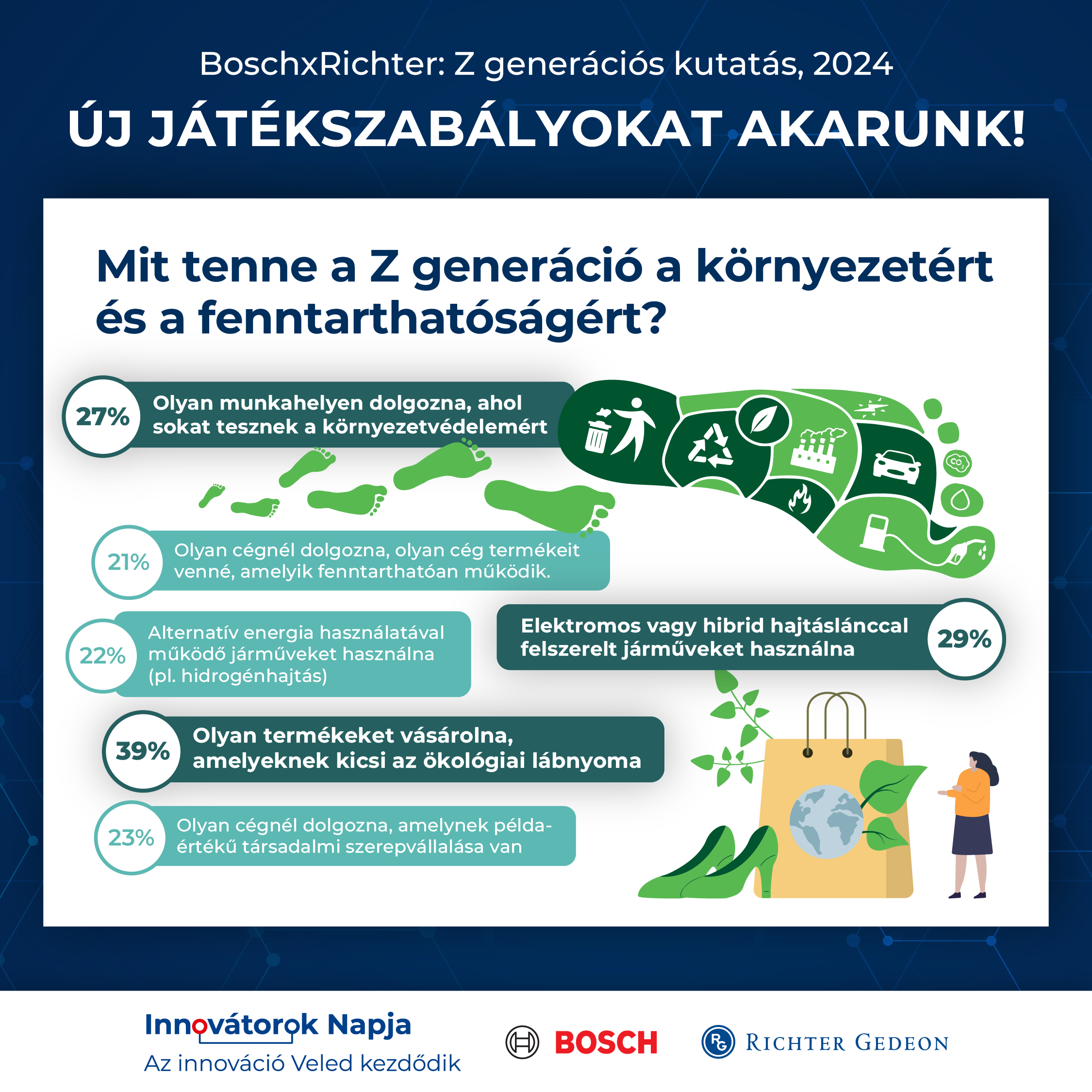 A Bosch×Richter kutatásból kiderül, hogy a vállalatokkal szembeni fenntarthatósági elvárások a munkavállalói döntésekben is megjelennek. A Z generációsok több mint negyede (27%) olyan munkahelyen dolgozna, ahol sokat tesznek a környezetvédelemért (ilyenek például a zéró széndioxid-kibocsátású vállalatok), vagy amelynek példaértékű társadalmi szerepvállalási programja van (23%).