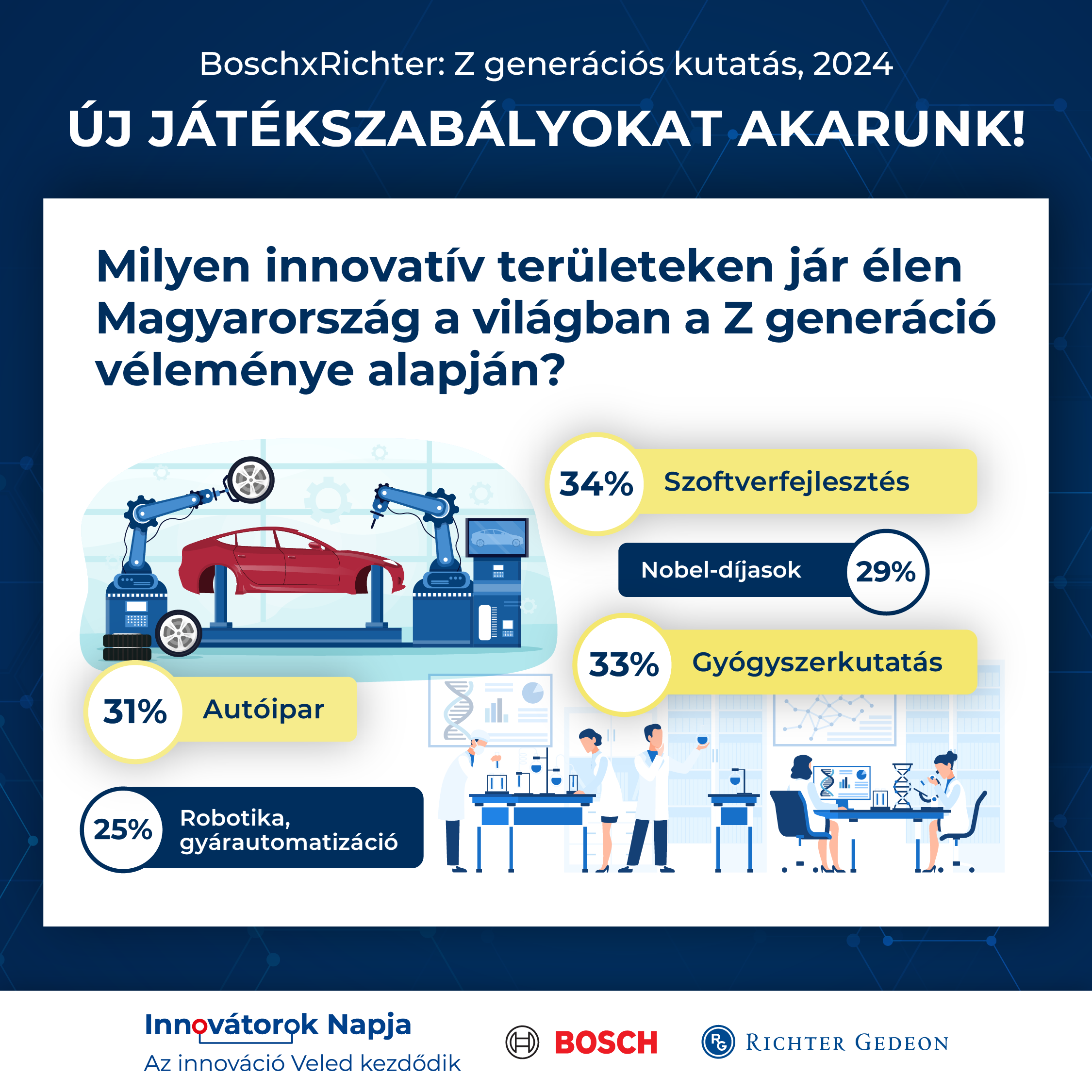 Az eredményekből jól látszik, hogy a hazai Z generáció szerint a Top 3 terület, ahol Magyarország ma élen jár az innovációban: a szoftveres megoldások, a szoftverfejlesztés (34%), a gyógyszerkutatás (33%) és az autóipar (31%). A megkérdezettek háromnegyede (75%) fontosnak tartja, hogy az innovációs folyamatokon keresztül magyarországi vállalatok és magyar szakemberek is részt vegyenek a világ fejlődésében. A kutatási eredmények alapján elmondható, hogy a hazai Z generáció nagy többsége a magyarországi Bosch csoportot (88%) és a Richter Gedeon Nyrt.-t (89%) is élenjárónak tartja ebben.