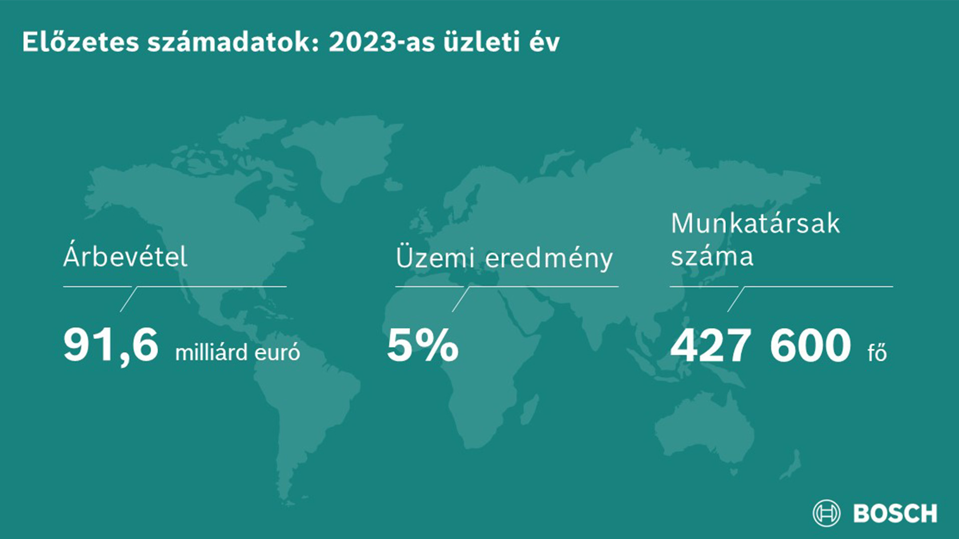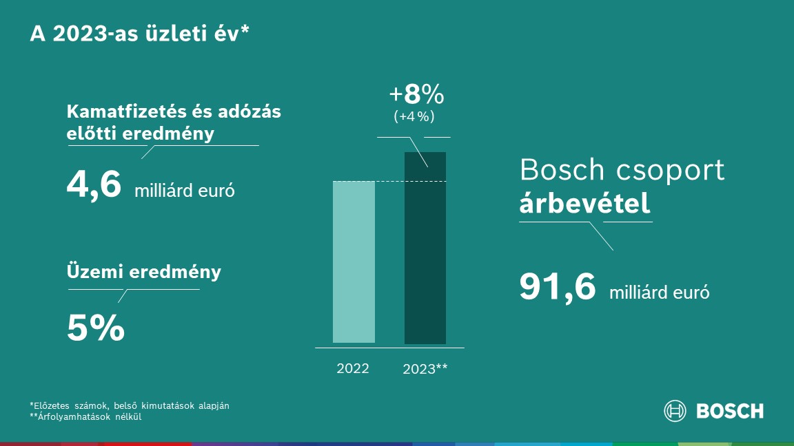 Stuttgart, Németország – A Bosch csoport a 2023-as üzleti év kihívásai ellenére is várakozásai szerint teljesített: az előzetes adatok1 alapján a technológiák és szolgáltatások szállítója árfolyamhatások nélkül 8 százalékos, árfolyamhatásokkal 4 százalékos növekedéssel, 91,6 milliárd euró árbevételt ért el. Az 5 százalékos üzemi eredmény enyhe javulást mutat az azt megelőző évi 4,3 százalékoshoz képest. „A Bosch számára 2023 nehezebb volt a vártnál. Különösen nagy erőfeszítések árán sikerült teljesíteni árbevétel- és eredménycélunkat, de a komoly kihívások ellenére is fejlődtünk” – hangsúlyozta Dr. Stefan Hartung, a Robert Bosch GmbH igazgatóságának elnöke a cégcsoport előzetes üzleti adatainak ismertetésekor. „Tekintettel a körülményekre, ez igazán figyelemreméltó teljesítmény. A következő évek szintén sokat követelnek majd mindannyiunktól.”