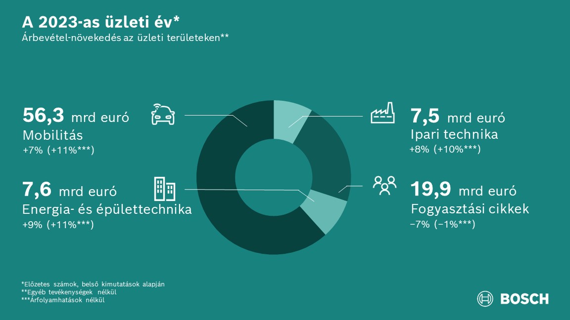 Vegyes képet mutatott 2023-ban az árbevétel alakulása a Bosch üzleti szektoraiban. 56,3 milliárd euróval 2023-ban is a mobilitás üzleti szektor érte el a legnagyobb árbevételt, ez 7 százalékos, árfolyamhatások nélkül 11 százalékos növekedést jelent. „Termékeink egyaránt keresettek a hagyományos és az új üzleti területeken. Folytatnunk kell a fejlesztéseket, és ez a feladat továbbra is jelentős erőfeszítéseket követel majd” – mondta Dr. Markus Forschner, a Robert Bosch GmbH igazgatóságának pénzügyi területekért felelős tagja. Az ipari technika üzleti szektor 7,5 milliárd euró árbevételt ért el, mely a HydraForce felvásárlás eredményeként 8 százalékkal, árfolyamhatások nélkül 10 százalékkal több az előző pénzügyi évhez képest. A fogyasztási cikkek üzleti szektor árbevétele 19,9 milliárd euró volt. „A kereslet visszaesése jelentős hatást gyakorolt az elektromos kéziszerszámok és a háztartási gépek üzletágunkra” – számolt be Forschner. Az árbevétel 7 százalékkal maradt el az előző évi szinttől, árfolyamhatások nélkül enyhe, 1 százalékos csökkenést jelent. Jelentősen, 9 százalékkal, árfolyamhatások nélkül 11 százalékkal 7,6 milliárd euróra növelte árbevételét az energia- és épülettechnika üzleti terület. „Nem csupán az energiahatékony és megújuló fűtéstechnika iránti nagy keresletből profitálhattunk, hanem szolgáltatási üzletágunk, a Bosch Global Service Solutions részlegbeli bővítéséből is” – mondta Forschner.