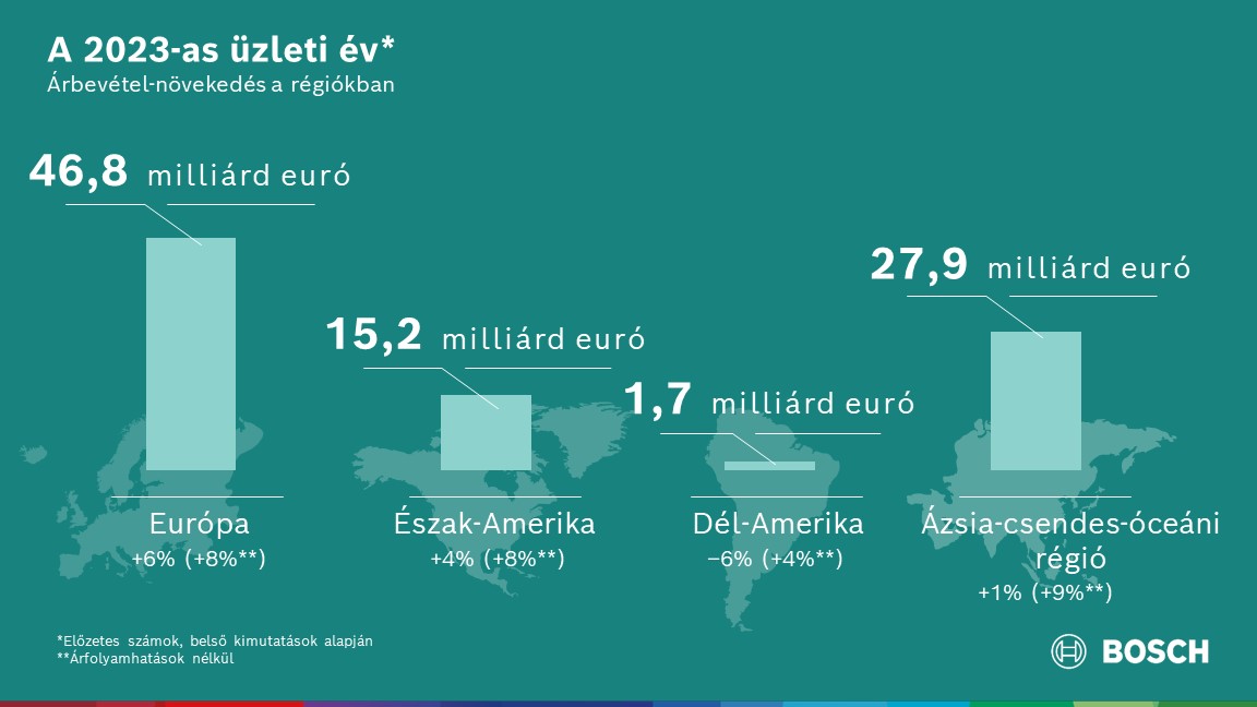 A Bosch árbevételének regionális alakulása is vegyes képet mutat. „A legintenzívebb növekedést Európa és Észak-Amerika érte el” – mondta Forschner. Európában az árbevétel 6 százalékkal, árfolyamhatások nélkül 8 százalékkal 46,8 milliárd euróra nőtt. Észak-Amerikában az árbevétel 4 százalékkal emelkedett és elérte a 15,2 milliárd eurót, ami az árfolyamhatások nélkül 8 százalékos növekedést jelent. A Dél-Amerikában elért 1,7 milliárd euró árbevétel 6 százalékkal alacsonyabb az előző évinél, míg árfolyamhatások nélkül 4 százalékos növekedésnek felel meg. Az ázsiai-csendes-óceáni térségben az árbevétel 1 százalékkal, árfolyamhatások nélkül 9 százalékkal 27,9 milliárd euróra nőtt. „Ezekben a számokban a kínai gazdaság néhány szektorának gyengébb teljesítménye is tükröződik” – mutatott rá Forschner. „Az Indiában és Japánban elért erőteljes növekedésünk csak részben tudta ezt ellensúlyozni.”