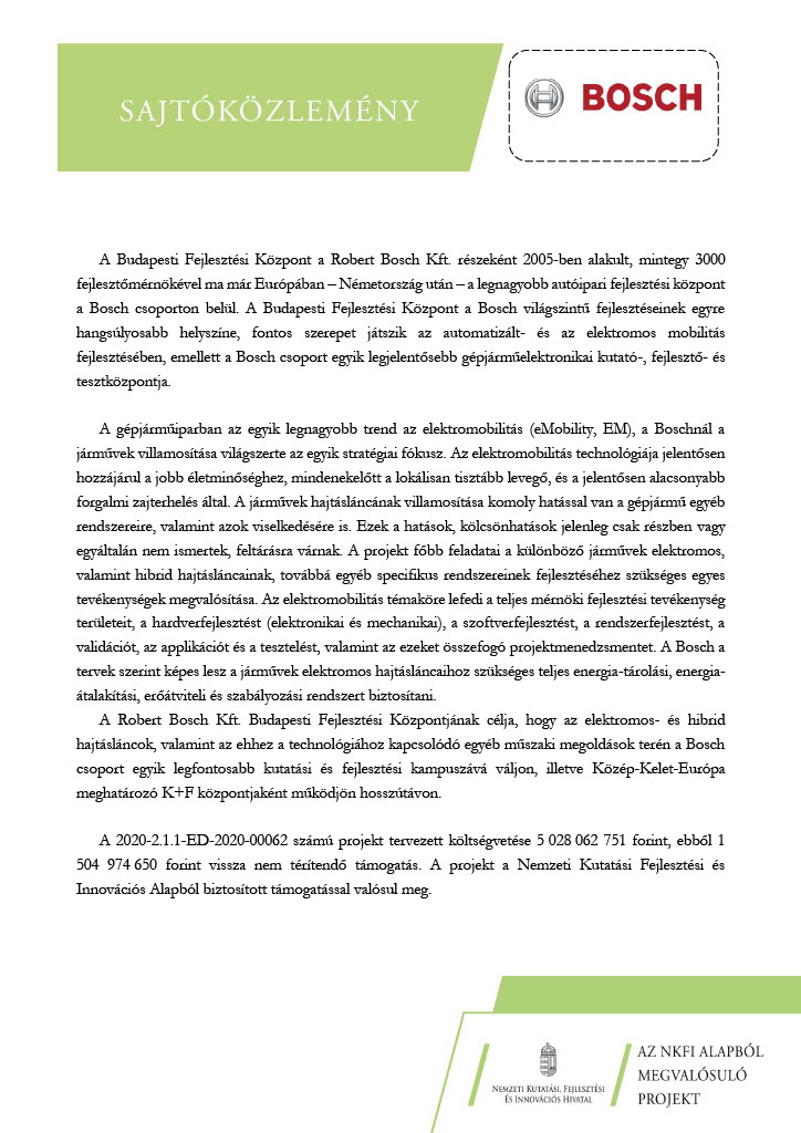 A járművek hajtásláncának villamosítása komoly hatással van a gépjármű egyéb rendszereire, valamint azok viselkedésére is. Ezek a hatások, kölcsönhatások jelenleg csak részben vagy egyáltalán nem ismertek, feltárásra várnak. A 2020-2.1.1-ED-2020-00062 számú projekt főbb feladatai a különböző járművek elektromos, valamint hibrid hajtásláncainak, továbbá egyéb specifikus rendszereinek fejlesztéséhez szükséges egyes tevékenységek megvalósítása. Az elektromobilitás témaköre lefedi a teljes mérnöki fejlesztési tevékenység területeit, a hardverfejlesztést (elektronikai és mechanikai), a szoftverfejlesztést, a rendszerfejlesztést, a validációt, az applikációt és a tesztelést, valamint az ezeket összefogó projektmenedzsmentet. A Bosch a tervek szerint képes lesz a járművek elektromos hajtásláncaihoz szükséges teljes energia-tárolási, energia-átalakítási, erőátviteli és szabályozási rendszert biztosítani.