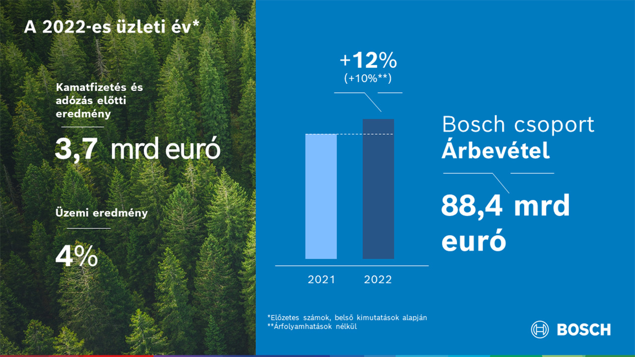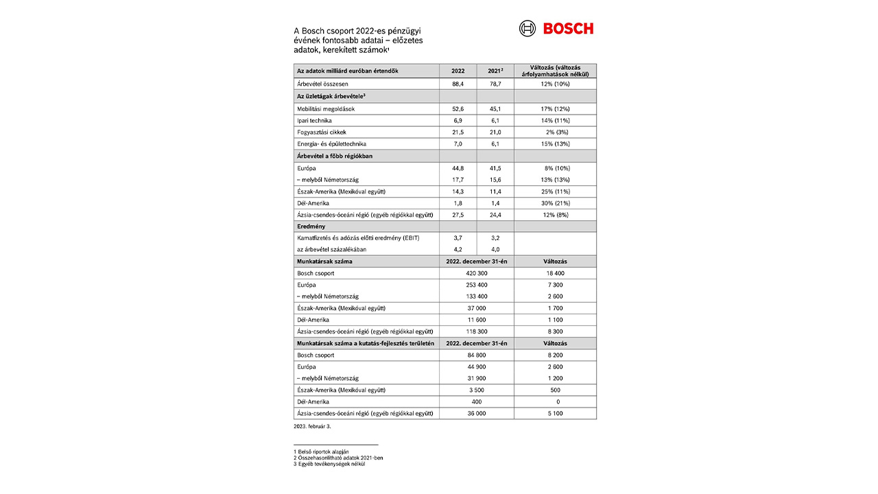Stuttgart, Németország – A kihívásokkal teli gazdasági helyzet ellenére a Bosch, a technológiák és szolgáltatások szállítója 2022-ben is növelte árbevételét és üzemi eredményét. Az előzetes adatok1 alapján a Bosch csoport árbevétele 88,4 milliárd euró volt, ami 12 százalékos – árfolyamhatások nélkül mintegy 10 százalékos – növekedést jelent az előző üzleti évhez viszonyítva. A kamatfizetés és adózás előtti eredmény 3,7 milliárd euróra nőtt, az üzemi eredmény várhatóan négy százalék körül alakul. „A kihívásokkal teli 2022-es üzleti év is igazolta, hogy a Bosch válságálló, miközben óriási innovációs erővel rendelkezik” – hangsúlyozta a vállalat előzetes pénzügyi adatainak bejelentésekor Dr. Stefan Hartung, a Robert Bosch GmbH igazgatóságának elnöke. „Továbbra is kihívásokkal teli környezetben, világszerte célzott beruházásokkal biztosítjuk növekedési lehetőségeinket és tovább bővítjük nemzetközi jelenlétünket. Célunk, hogy Életre tervezett technológiákat kínáljunk az embereknek, jelentős társadalmi hozzájárulást is teljesítve ezzel – a klímabarát fűtéstől az energiatakarékosságon át a hosszútávon fenntartható mobilitásig.”