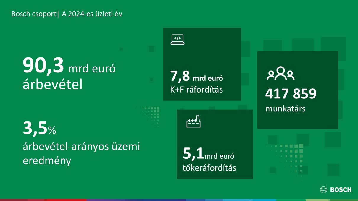 Stuttgart és Renningen, Németország – A Bosch csoport folytatja ambiciózus 2030-as stratégiáját, hogy ezzel is erősítse a vállalatcsoport pozícióit. Bár a piaci környezet tavaly jelentősen hátráltatta a növekedést, 2024-ben a technológiák és szolgáltatások szállítója 90,3 milliárd eurós árbevételt ért el, ami 1,4 százalékkal – árfolyamhatások nélkül 0,5 százalékkal – marad el az azt megelőző év eredményeitől. A kamatfizetés és az adózás előtti eredmény (EBIT) 3,1 milliárd euró volt (2023: 4,8 milliárd euró); az árbevétel-arányos üzemi eredmény pedig 3,5 százalék. A vállalat éves eredményeinek ismertetésekor Stefan Hartung, a Robert Bosch GmbH igazgatóságának elnöke elmondta: „A 2024-es üzleti évben jelentős fejlődést értünk el a költségek, a struktúrák és a portfólió tekintetében. Kitartunk ambiciózus céljaink mellett, hogy tovább növekedjünk és megerősítsük pénzügyi függetlenségünket. A 2030-as stratégiánk jelöli az irányt. Különösen most, hogy az üzleti élet szereplőinek a világban mindenütt komoly kihívásokkal kell szembenézni, a célunk az, hogy legkésőbb öt éven belül az első három legnagyobb beszállító közé kerüljünk kulcsfontosságú piacainkon.”