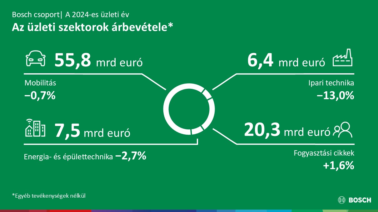 Minden üzleti szektor megérezte a kedvezőtlen világpiaci hatásokat. A járműgyártás globális visszaesésének köszönhetően a mobilitás üzleti szektor árbevétele 55,8 milliárd euró lett, ami 0,7 százalékkal elmarad az előző évitől, azonban árfolyamhatások nélkül az árbevétel 0,2 százalékkal emelkedett. Az árbevétel-arányos üzemi eredmény 3,8 százalék volt (2023: 4,4 százalék). Az ipari technika szektor 6,4 milliárd eurós árbevételt ért el. Ez 13,0 százalékos –árfolyamhatások nélkül 12,5 százalékos – visszaesést jelent. Ebben kulcsszerepet játszott az építőiparban és a gépiparban tapasztalható, a vártnál meredekebb visszaesés a főbb piacokon, Európában, Észak-Amerikában és Kínában. Az árbevétel-arányos üzemi eredmény 1,2 százalék volt (2023: 9,1 százalék). A fogyasztási cikkek üzleti terület 1,6 százalékkal 20,3 milliárd euróra növelte árbevételét, ami árfolyamhatások nélkül 2,9 százalékos növekedésnek felel meg. Az árbevétel-arányos üzemi eredmény 3,5 százalék volt (2023: 4,5 százalék). Az energia- és épülettechnika üzleti szektorban az árbevétel 2,7 százalékkal 7,5 milliárd euróra csökkent. Árfolyamhatások nélkül ez 2,6%-os csökkenésnek felelt meg. Ennek fő oka az európai fűtési piac visszaesése volt. Az árbevétel-arányos üzemi eredmény 4,9 százalék volt (2023: 9,0 százalék).
