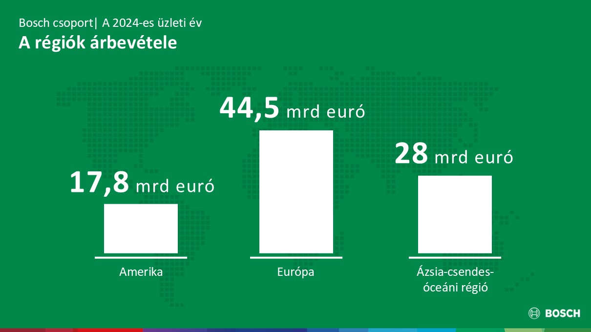 A Bosch főbb piacainak gyengeségét Európában érezte leginkább. Míg az árbevétel ebben a régióban 4,9 százalékkal – árfolyamhatások nélkül 4,6 százalékkal – 44,5 milliárd euróra csökkent, a vállalat a világ többi régiójában növekedést könyvelhetett el. Amerikában 4,8 százalékkal – árfolyamhatások nélkül 5,7 százalékkal – 17,8 milliárd euróra, az ázsiai-csendes-óceáni térségben pedig 0,7 százalékkal – árfolyamhatások nélkül 2,8 százalékkal – 28,0 milliárd euróra nőtt.