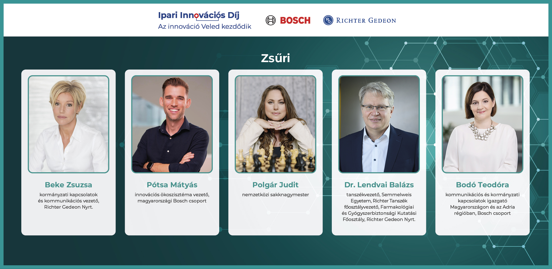 A zsűri tagja Polgár Judit olimpiai bajnok, nemzetközi sakknagymester, 25 éve világranglista vezető, a Halhatatlan Magyar Sportolók Egyesületének tagja, a Nemzeti Tehetségsegítő Tanács kinevezett Magyar Tehetség Nagykövete. Polgár Judit sportága innovációs nagyköveteként 2012-ben indította útjára alapítványát, a Polgár Judit Sakk Alapítványt, amely a jövő generációinak és az őket oktatóknak nyújt egyedülálló módszert a komplex képességfejlesztésre. A zsűri további tagjai: Beke Zsuzsa, a Richter Gedeon Nyrt. kormányzati kapcsolatok és kommunikációs vezetője, Dr. Lendvai Balázs, a Semmelweis Egyetem Richter Tanszékének vezetője, a Richter Gedeon Nyrt., Farmakológiai és Gyógyszerbiztonsági Kutatási Főosztály főosztályvezetője, Bodó Teodóra, a Bosch csoport kommunikációs és kormányzati kapcsolatok igazgatója Magyarországon és az Adria régióban, valamint Pótsa Mátyás, a magyarországi Bosch csoport innovációs ökoszisztéma vezetője.