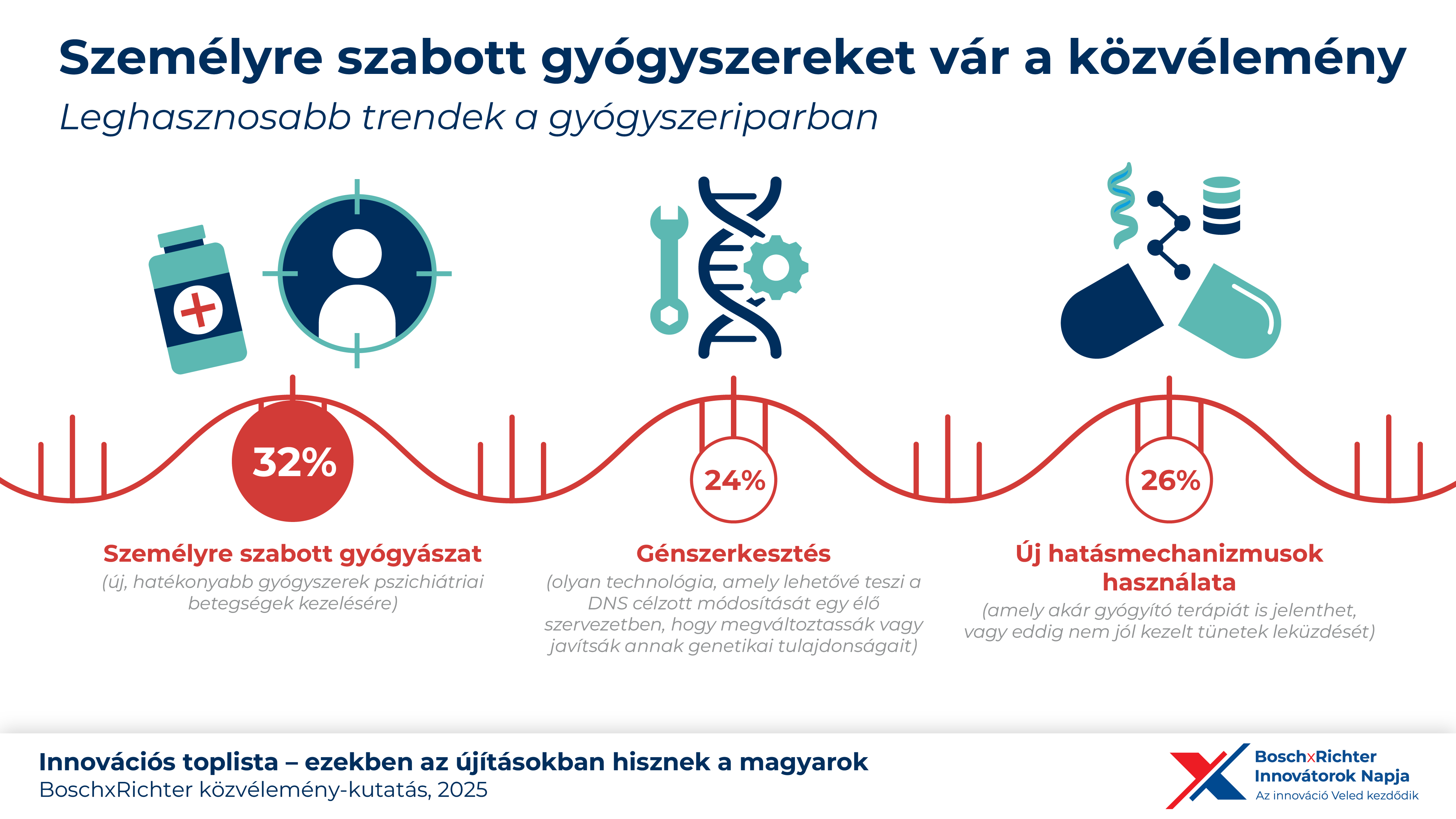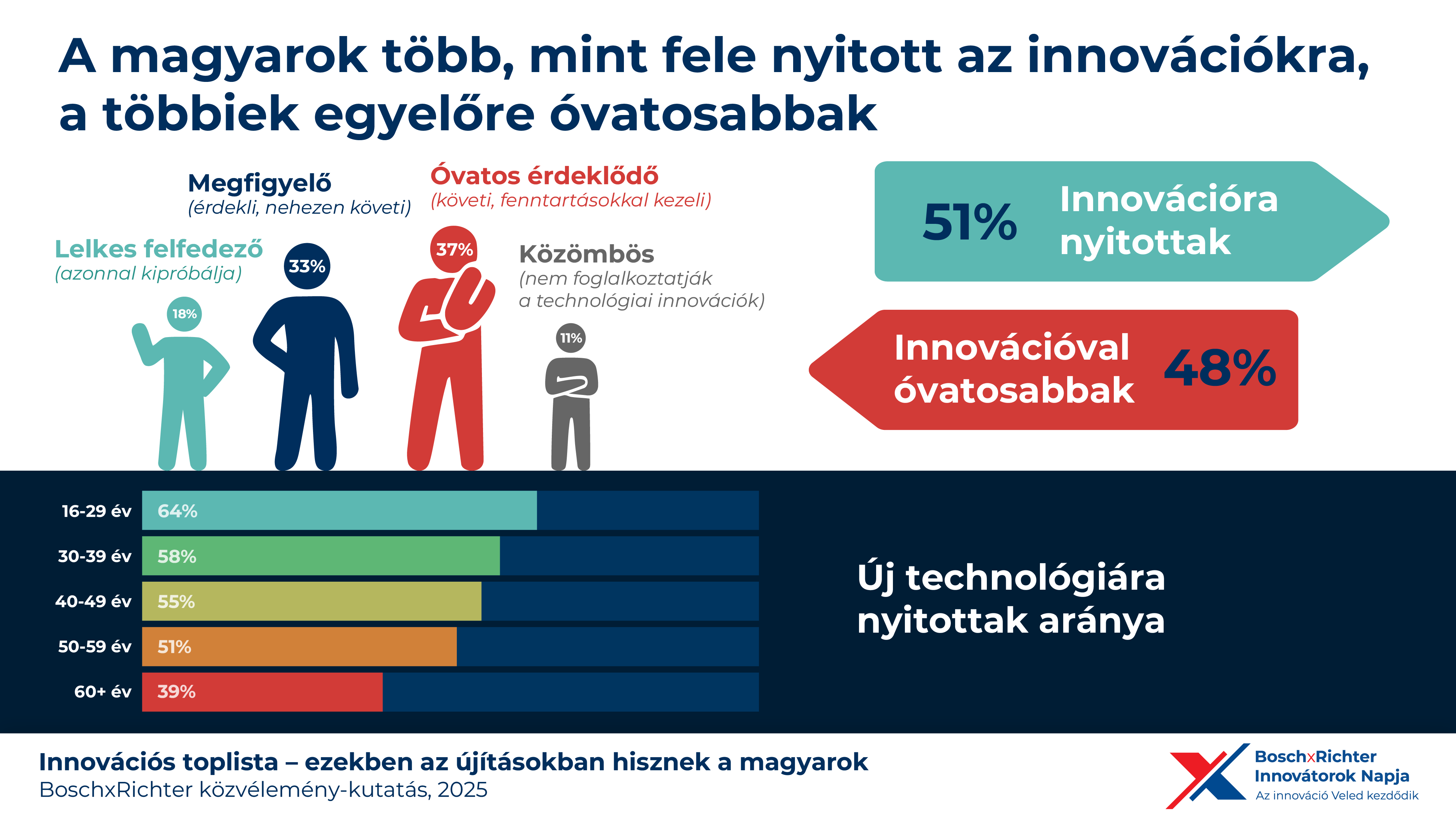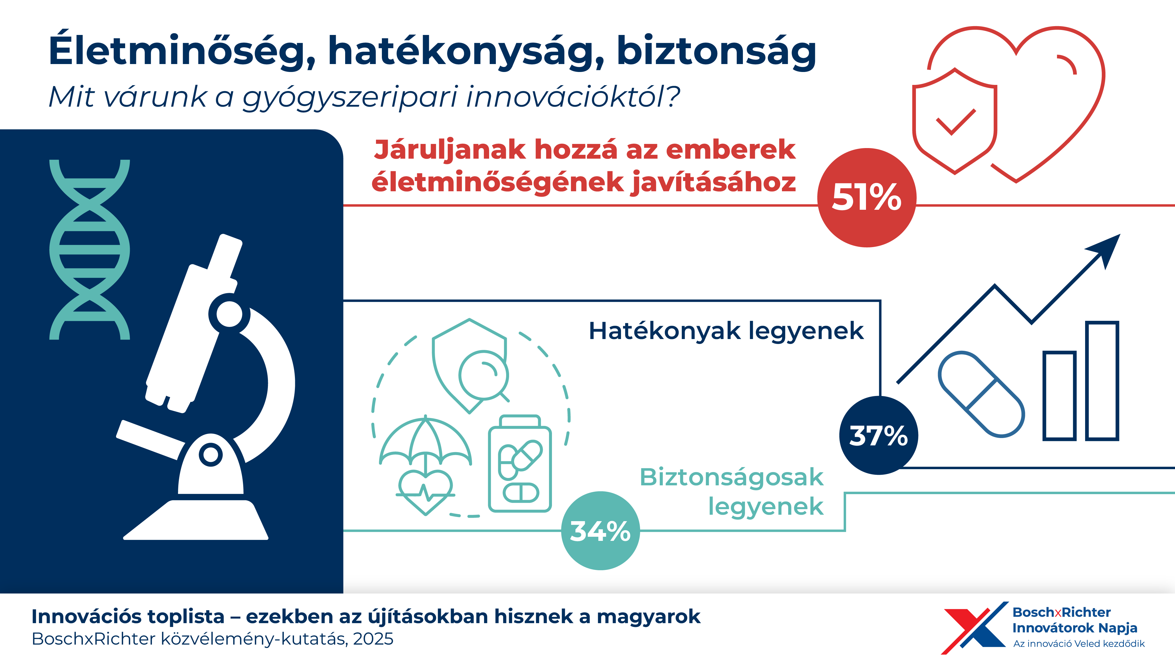 Budapest – Megosztott a hazai közvélemény a technológiai trendek megítélésében: bár vannak fenntartások, az életminőség javulását a többség hosszú távon az innovációktól, különösen a technológiai és tudományos fejlesztésektől várja. Milyen innovatív megoldásoknak örülnének a magyarok? Hisznek-e az mRNS technológiában vagy a 3D-nyomtatható szervekben? Utaznának-e légitaxival vagy hidrogénvonaton? A közlekedés és a gyógyszeripar jövőjével foglalkozik a magyarországi Bosch csoport és a Richter Gedeon Nyrt. „Innovációs toplista: ezekben az újításokban hisznek a magyarok” című kutatása, melynek friss eredményeit a BoschxRichter Innovátorok Napja konferencián mutatta be közösen a két hazai nagyvállalat 2025. szeptember 23-án a Bosch Budapest Innovációs Kampuszon.