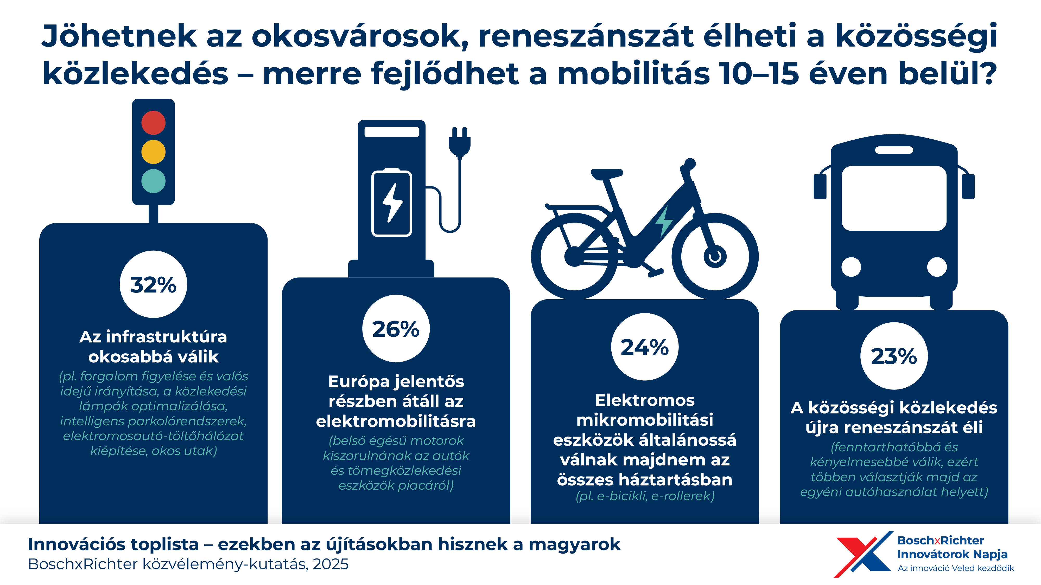 A válaszadók közel harmada szerint 10–15 éven belül az infrastruktúráink okosabbá válhatnak (32%): megvalósulhat a forgalom valós idejű figyelése és automatikus irányítása, a közlekedési lámpák intelligens optimalizálása, az okosutak és a szabad helyeket „látó” városi parkolási rendszerek is. Minden negyedik válaszadó (23–26%) ennél is tovább megy. Szerintük a következő egy-másfél évtizedben Európa jelentős részben átáll az elektromobilitásra, vagyis a belső égésű motorok kiszorulnak az autók és tömegközlekedési eszközök piacáról. Ezzel párhuzamosan az elektromos mikromobilitási eszközök, e-kerékpárok, e-rollerek általánossá válnak majdnem az összes háztartásban. A közösségi közlekedés pedig újra reneszánszát éli majd: fenntarthatóbbá és kényelmesebbé válik, így többen fogják választani az egyéni autóhasználat helyett.