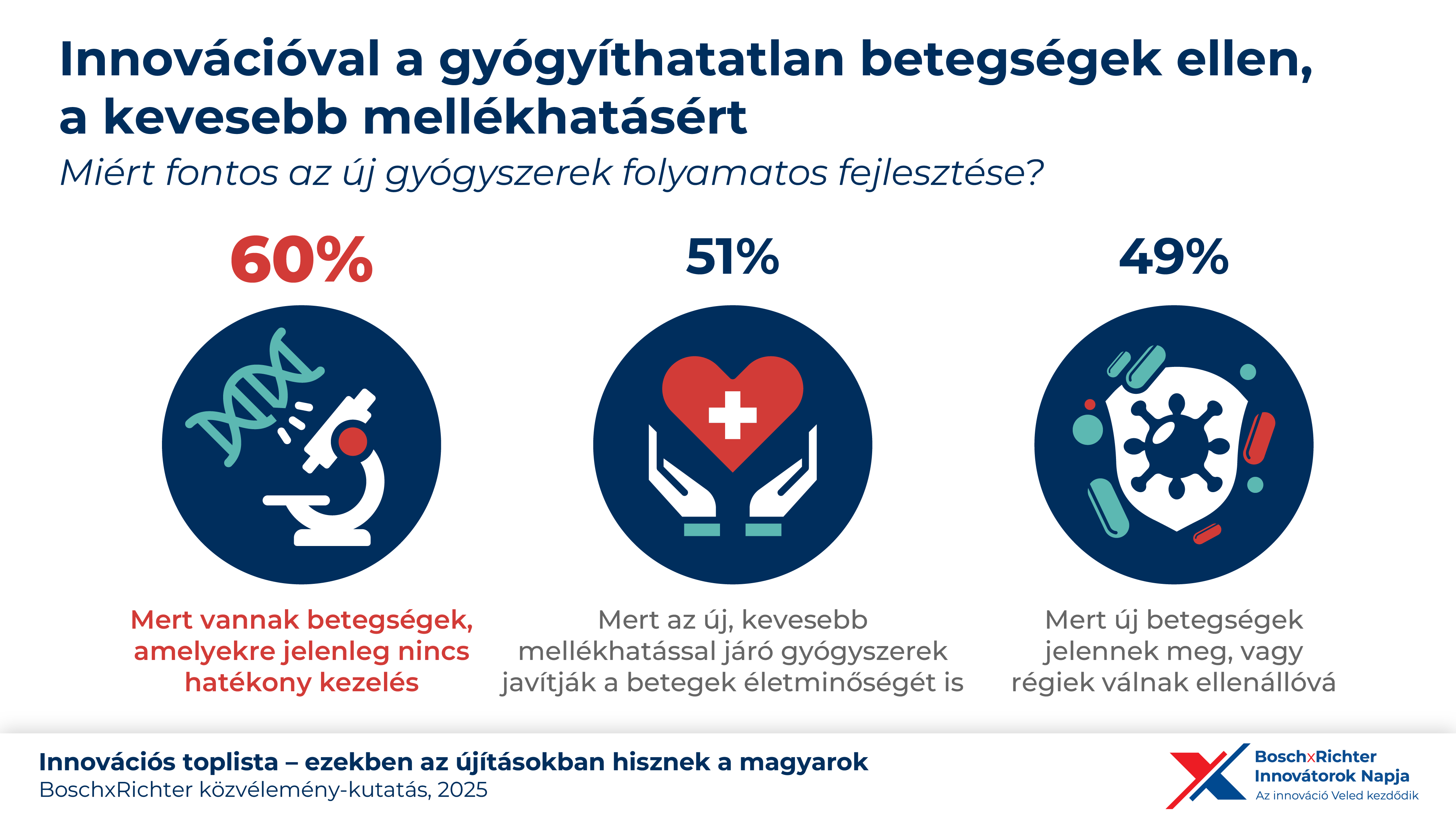 Az új, innovatív gyógyszerek kifejlesztését elsősorban a ma még gyógyíthatatlan betegségek miatt tartja fontosnak a lakosság döntő többsége (60%). Emellett minden második válaszadó a gyógyszerek mellékhatásainak csökkentését (51%) is célként jelöli meg, de az új betegségek megjelenése és a régiek ellenállóvá válása miatt is (49%) szükségesnek tartják a folyamatos gyógyszeripari innovációt.