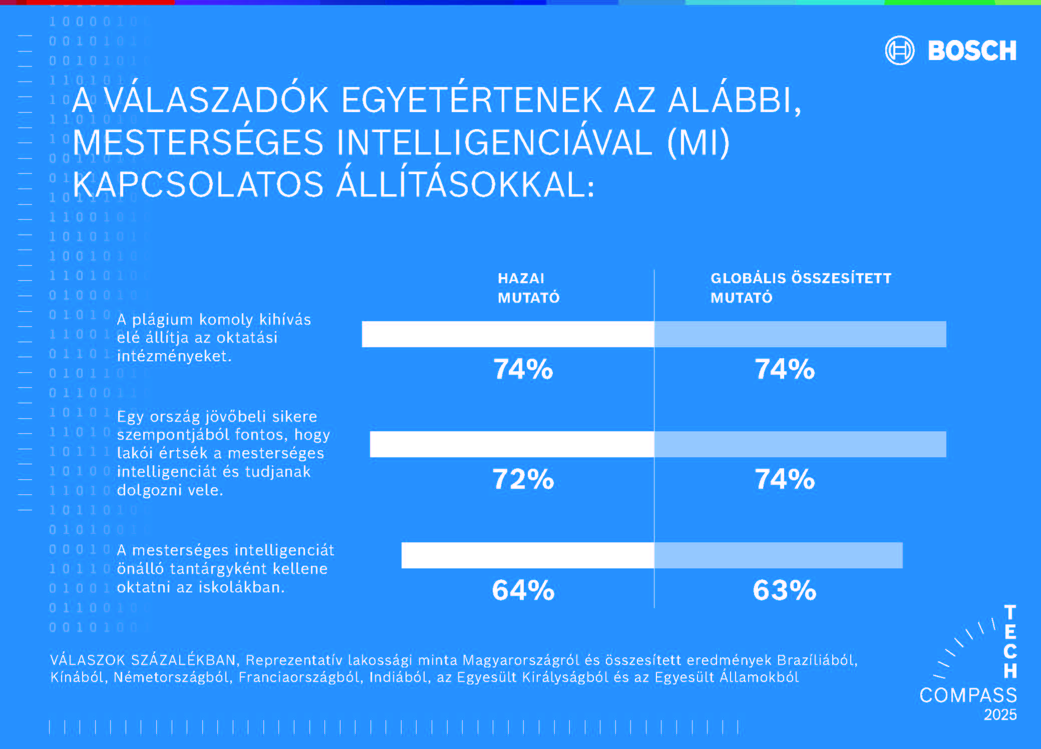 Budapest – A mesterséges intelligencia (MI)-készségek nem csupán a munkában, hanem a magánéletünkben is egyre fontosabb szerepet kapnak. Ebben szinte teljesen egyetért az idei Bosch Tech Compass felmérés során világszerte megkérdezett több mint 11 000 résztvevő, és nincs ez másképpen Magyarországon sem. A magyarok 53 százaléka gondolja úgy, hogy a mesterséges intelligencia lesz a következő évtized meghatározó technológiája. Jóllehet ez az arány valamivel elmarad a világ 65 százalékos átlagától, azonban a hazai és a nemzetközi válaszadók 71-71 százaléka gondolja úgy, hogy a mindennapi életben elengedhetetlenek lesznek az MI-készségek.