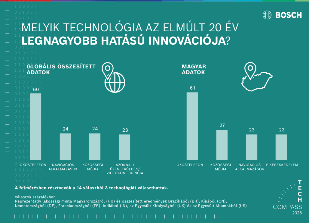 Kétségtelen, hogy az okostelefon az elmúlt két évtized technológiai fejlődésének megkerülhetetlen mérföldköve. Hatása az élet minden területén érezhető. A Bosch Tech Compass felmérés egyértelműen alátámasztja globális jelentőségét. Világszerte a válaszadók 60 százaléka – Magyarországon 61 százalékuk – jelölte meg az okostelefont az elmúlt 20 év legmeghatározóbb innovációjaként. A résztvevők szerint az okostelefonnal szorosan összefüggő technológiák is kiemelkedő jelentőséggel bírnak. Világszerte a navigációs alkalmazások (24 százalék), a közösségi média (24 százalék) és az azonnali üzenetküldés/videokonferencia (23 százalék) állnak a rangsorban. Hazánkban pedig a közösségi média (27 százalék), a navigációs alkalmazások (23 százalék) és az e-kereskedelem (23 százalék) bizonyultak a legfontosabbnak.
