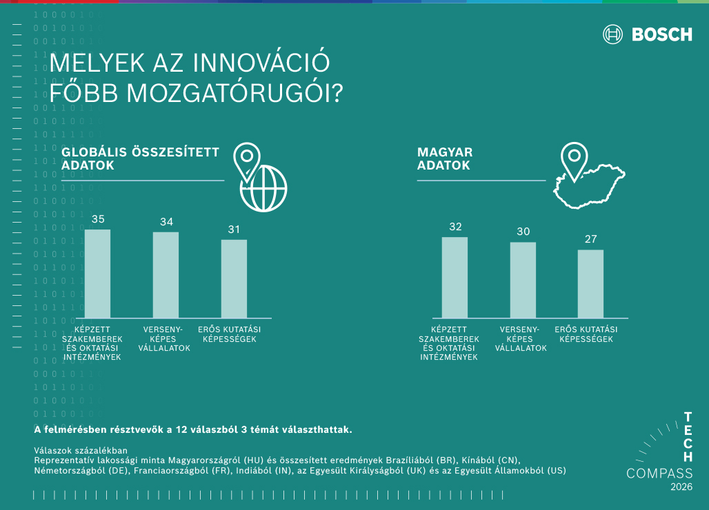 Budapest – Az innovációk hatással vannak az emberek mindennapjaira, kulcsfontosságúak a társadalmi és a gazdasági kihívások megoldásában is. A nemzetközi Bosch Tech Compass felmérés kiemeli az okostelefon utóbbi két évtizedben betöltött, egyedülállóan meghatározó szerepét, mint – a válaszadók szerint – a legfontosabb innovációt globálisan és Magyarországon is. A technológiai fejlődés motorja azonban egy olyan komplex innovációs ökoszisztéma, ahol a képzett szakemberek, az oktatási és kutatási intézmények, valamint az ipari szféra összehangolt együttműködése alapvető a piacképes megoldásokhoz. Érdekes módon, míg a válaszadók szerint világszerte az IT és telekommunikáció áll az élen, addig Magyarországon a gyártás a fő innovációs hajtóerő.