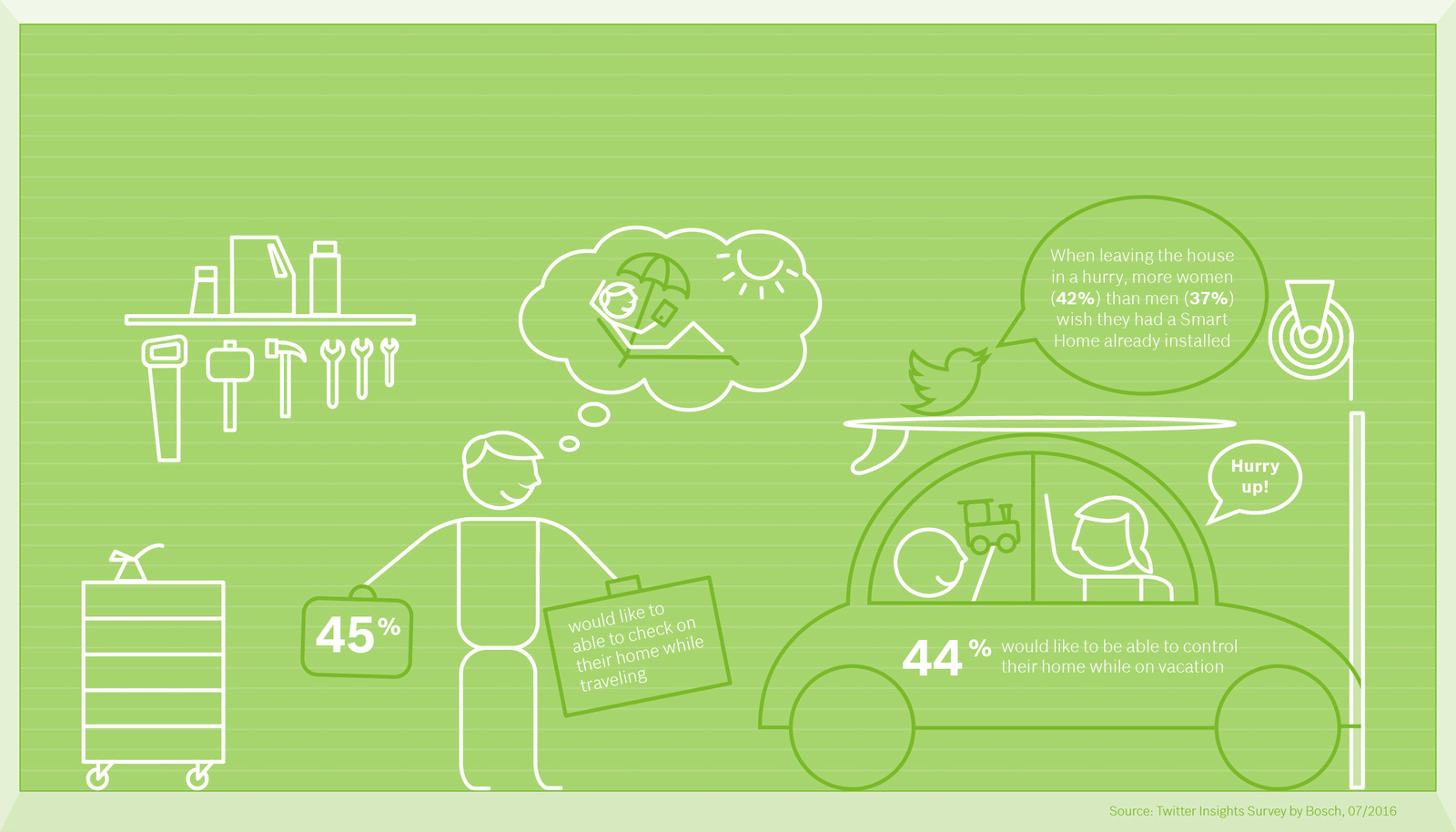 A közelmúltban a Bosch a Twitterrel közösen megkérdezte a felhasználóktól, hogy mit tudnak az okosotthonokról és mit várnak el azoktól. A kérdőívet Németországban, Franciaországban, Nagy Britanniában, Ausztriában, Spanyolországban és az Amerikai Egyesült Államokban élő felhasználók töltötték ki. A britek és az amerikaiak számára a hálózatba kapcsolt otthonnak helye van a mindennapokban. Legalábbis akkor, ha megkérdezzük, milyen helyzetekben szeretnék menet közben vezérelni az okosotthonukat. A válaszadó britek és amerikaiak 60 százaléka szeretne használni ilyen funkciót vonaton vagy autóval utazva. A spanyolok, a németek és az osztrákok esetében ez az arány csupán feleakkora, ám a franciák esetében eléri a 45 százalékot. Hasonlóan fest az országok közötti arány akkor is, amikor a megkérdezetteknek sietnie kell. Amúgy a sietség egy olyan szituáció, amely esetében különösen a hölgyek gondolják úgy, hogy nagy előnyt biztosíthatna számukra az okosotthon. Ebben egyezik a véleményük a legfiatalabb (16–24 éves korosztály) megkérdezettekkel, akik ezenkívül különösen a kanapén ülve szeretnék kihasználni az okosotthon nyújtotta előnyöket. Országtól, életkortól és nemtől függetlenül lenyűgözte a válaszadókat a lehetőség, hogy nyaralás közben is elérhetik az okosotthonukat. Ez a lelkesedés az életkorral csak fokozódik – hiszen ellenőrizhetik a lakók, hogy minden rendben van-e odahaza, vagy a hazautazás előtt feltekerhetik a fűtést.