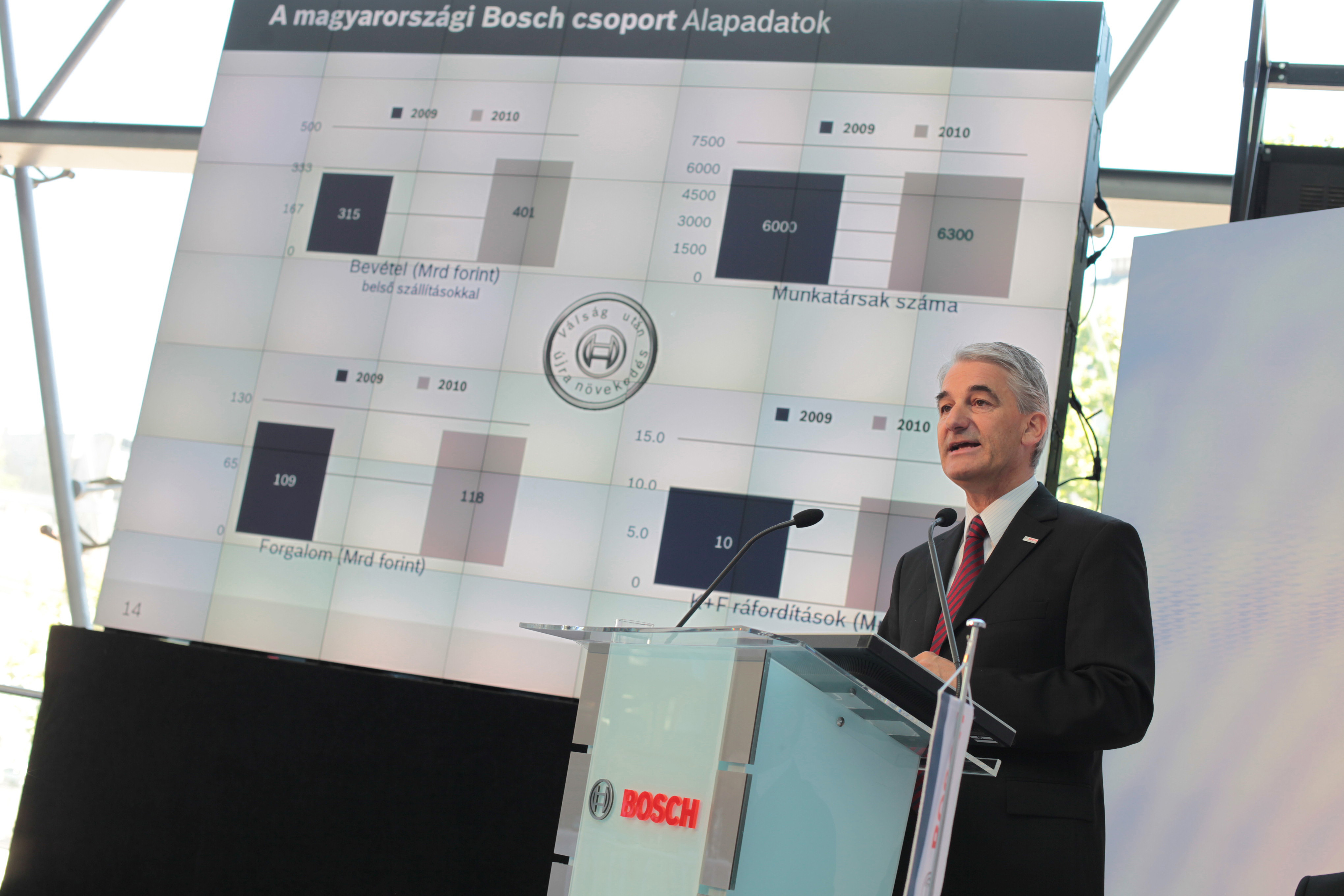 Budapest - A 2010-es üzleti évben a magyarországi Bosch csoport visszaállt a stabil növekedési pályára. A Bosch teljes hazai forgalma 27 százalékkal 401 milliárd forintra emelkedett, mialatt a Bosch csoport magyarországi árbevétele – amelybe nem tartoznak bele a saját vállalatai között folytatott kereskedelmi tevékenységek – 118 milliárd forint lett, mely 8 százalékos növekedést jelentett. A beruházások értéke megközelítette a 21 milliárd forintot, aminek nagy részét a hatvani és miskolci üzem gyártási kapacitásának bővítése tette ki. A vállalat 2010-ben 11 milliárd forintot költött a stratégiai jelentőségű hazai kutatás-fejlesztésre. A 2010-es üzleti eredményeket és a közeljövő fejlesztési terveit bemutató budapesti sajtótájékoztatón a magyarországi Bosch csoport vezetője Thomas Beyer így fogalmazott: „Az idei üzleti évben 10%-ot meghaladó növekedésre számítunk, különösen a gépjármű technológia területén.” 2011. január 1-jén a magyarországi Bosch csoport létszáma 6300 fő volt.