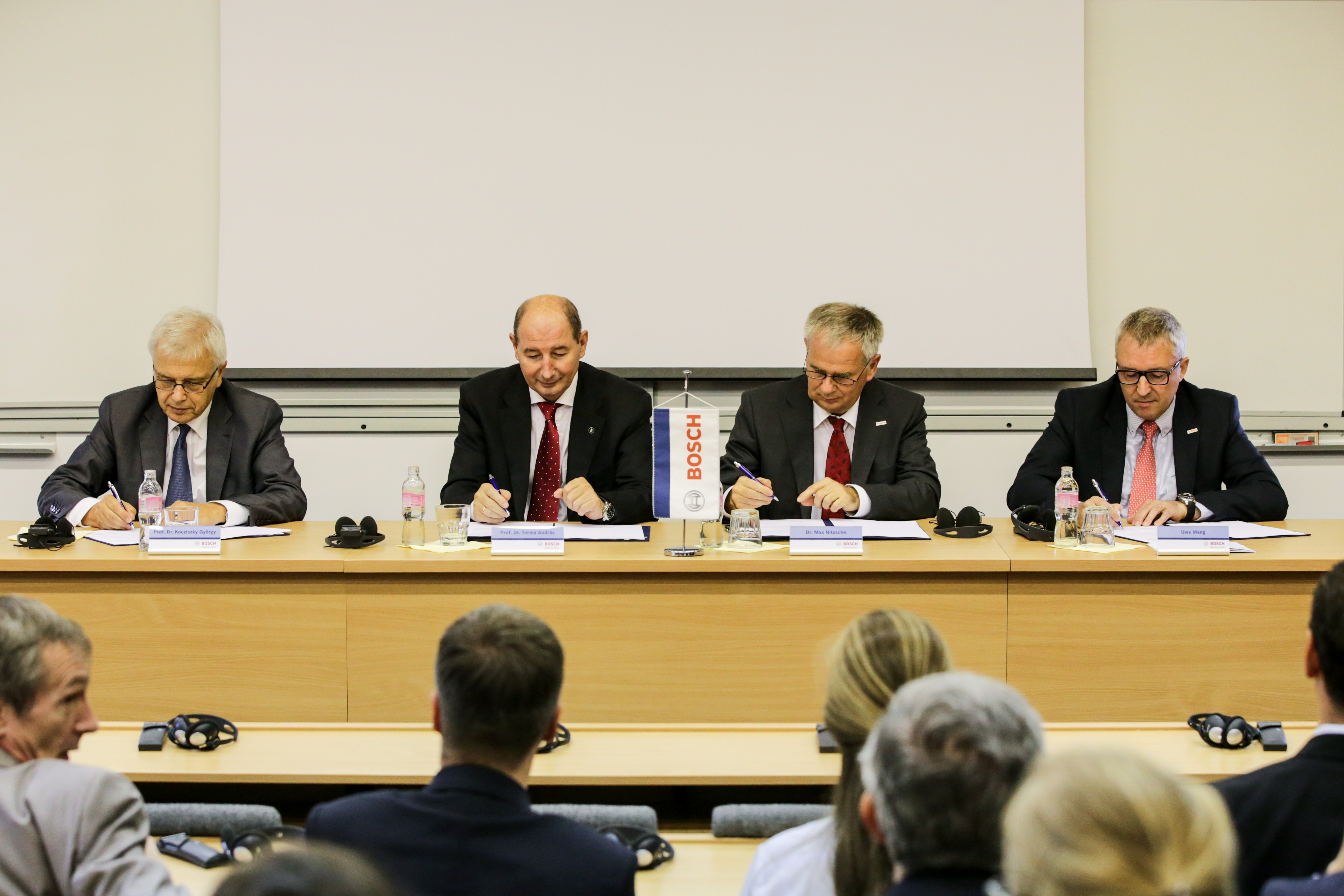 Miskolc – Robert Bosch Energy and Body Systems Kft. of Miskolc has signed an agreement with the University of Miskolc to set up the Bosch Lean Academy. The agreement was signed by Prof. Dr András Torma, Rector of Miskolc University, Prof. Dr György Kocziszky, Teacher of Miskolc University and from the Bosch automotive components plant in Miskolc, Dr Max Nitzsche, Plant Manager, and Uwe Mang, Commercial Plant Manager. The Bosch Lean Academy will extend dual, practice-oriented training, hitherto only found in secondary education, into the higher educational sphere. Bosch and Miskolc University are also collaborating with the chief lean-management organisation, Lean Enterprise Institute, Hungary.
